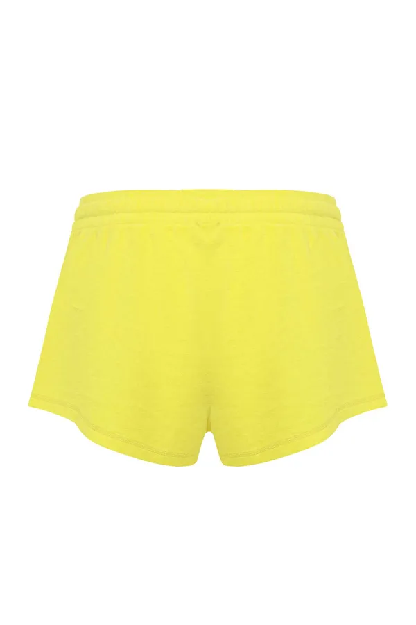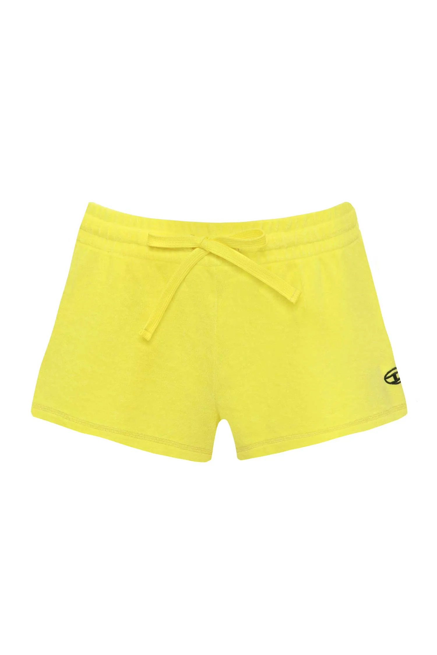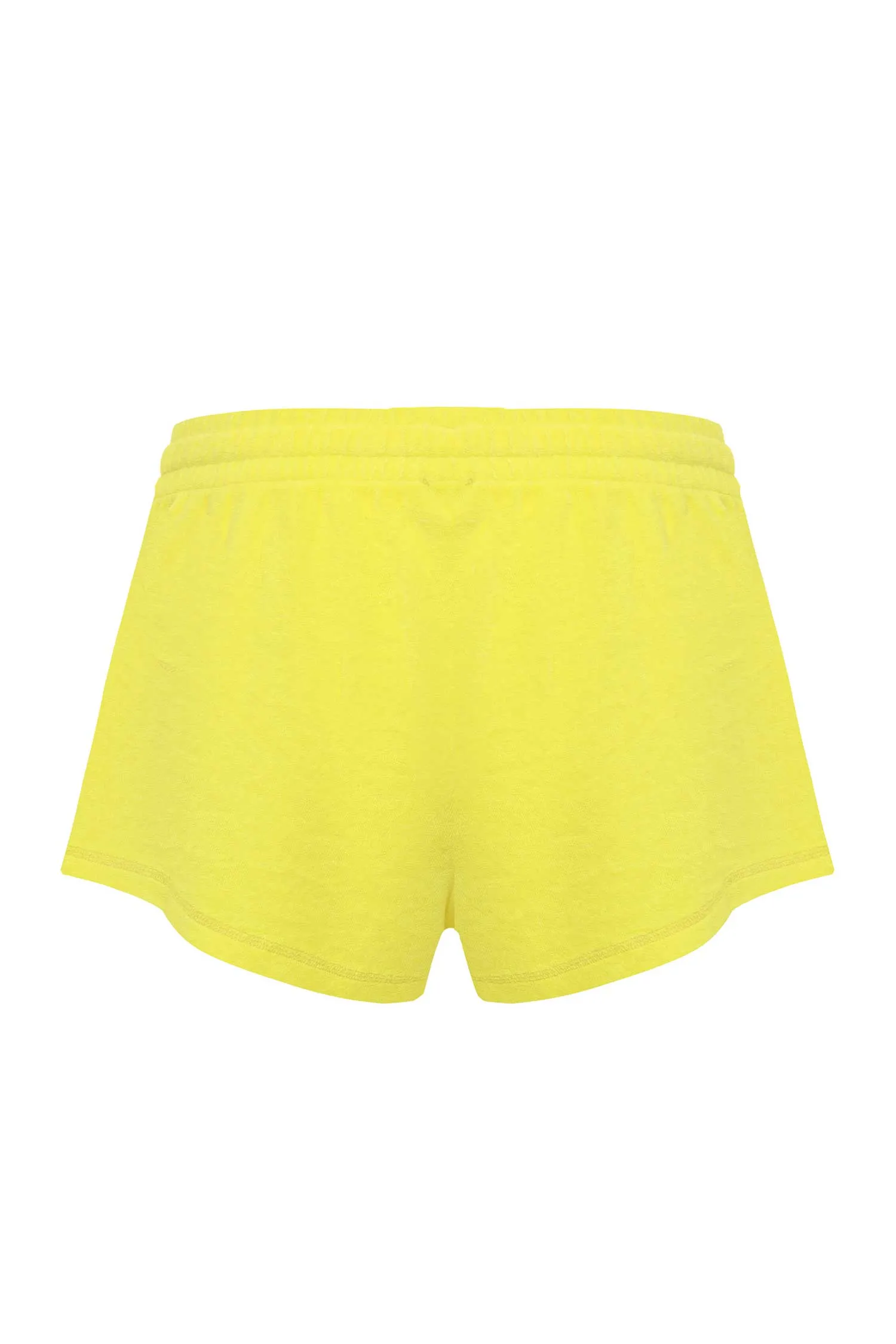 ШОРТЫ ЖЁЛТЫЕ, МАХРОВЫЕ, СБОКУ ВЫШИТОЕ ЧЁРНОЕ ЛОГО, ЭЛАСТИЧНЫЙ ПОЯС НА КУЛИСКЕ