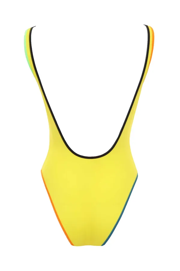 DIESEL КУПАЛЬНИК КРАСНО-ЖЁЛТЫЙ С РАЗНОЦВЕТНОЙ ОКАНТОВКОЙ, СЛИТНЫЙ, ПРОРЕЗИНЕН.ЧЁРНОЕ ЛОГО