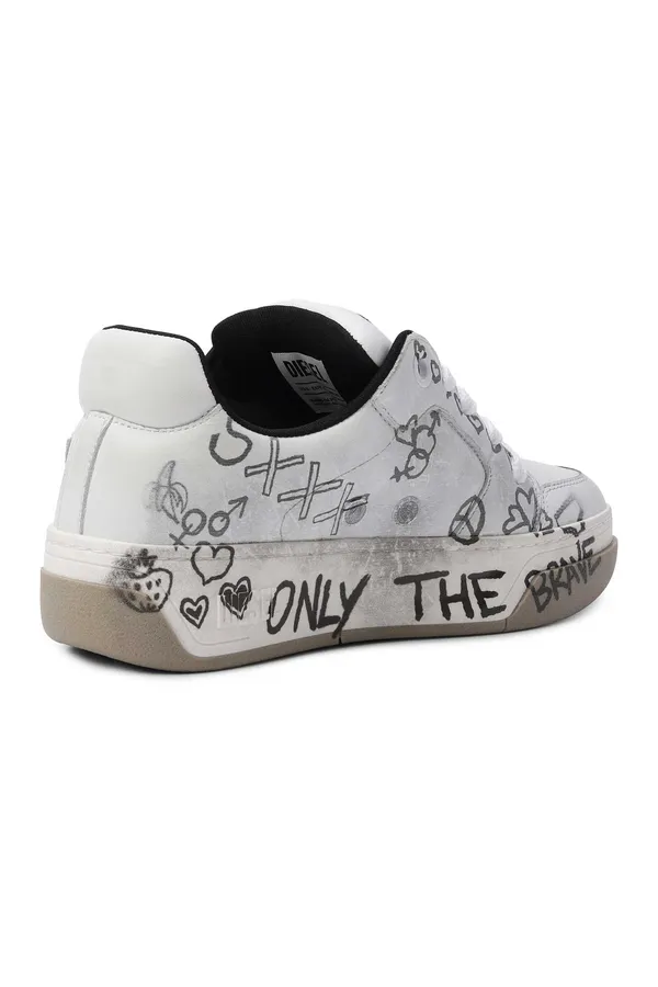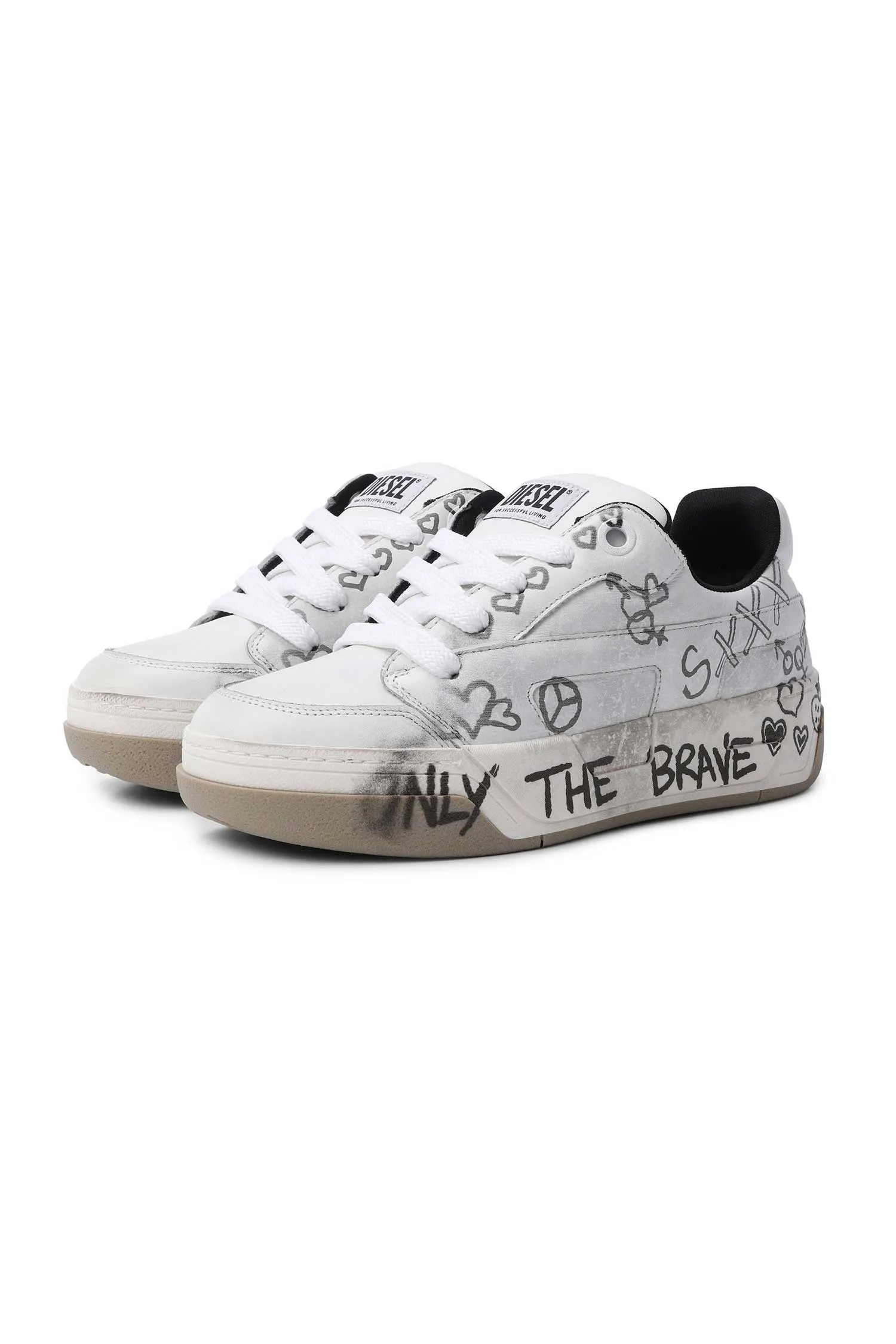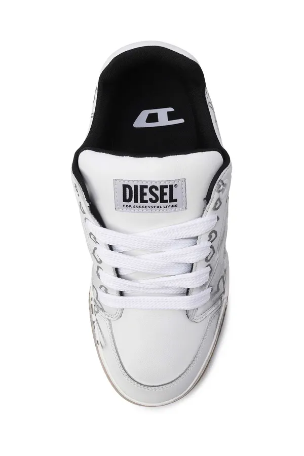 DIESEL КЕДЫ S-D-OLLIE LOW W БЕЛЫЕ С ГРАФИЧЕСКИМИ НАДПИСЯМИ, ВИНТАЖ, СКРЫТАЯ ПЛАТФОРМА, НАШИВКА-ЛОГО НА ЯЗЫЧКЕ, К=4,5