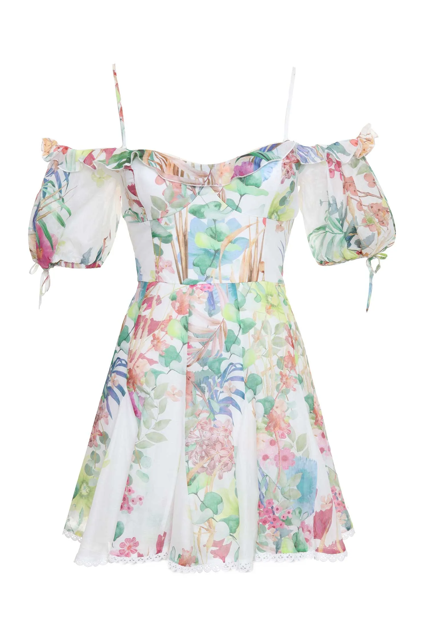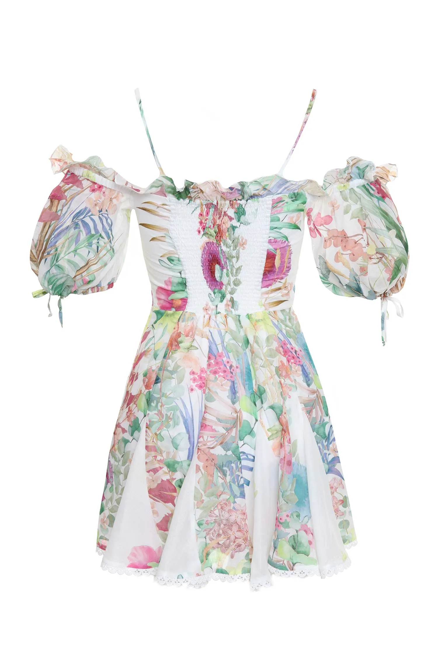 ПЛАТЬЕ SERIS БЕЛО-ЗЕЛЁНО-РОЗОВОЕ, ПРИНТ ЦВЕТЫ, КОРОТКОЕ, ОТД.КРУЖЕВО, ОТТКРЫТЫЕ ПЛЕЧИ, ТОНКИЕ БРЕТЕЛЬКИ, РУКАВА-ФОНАРИКИ