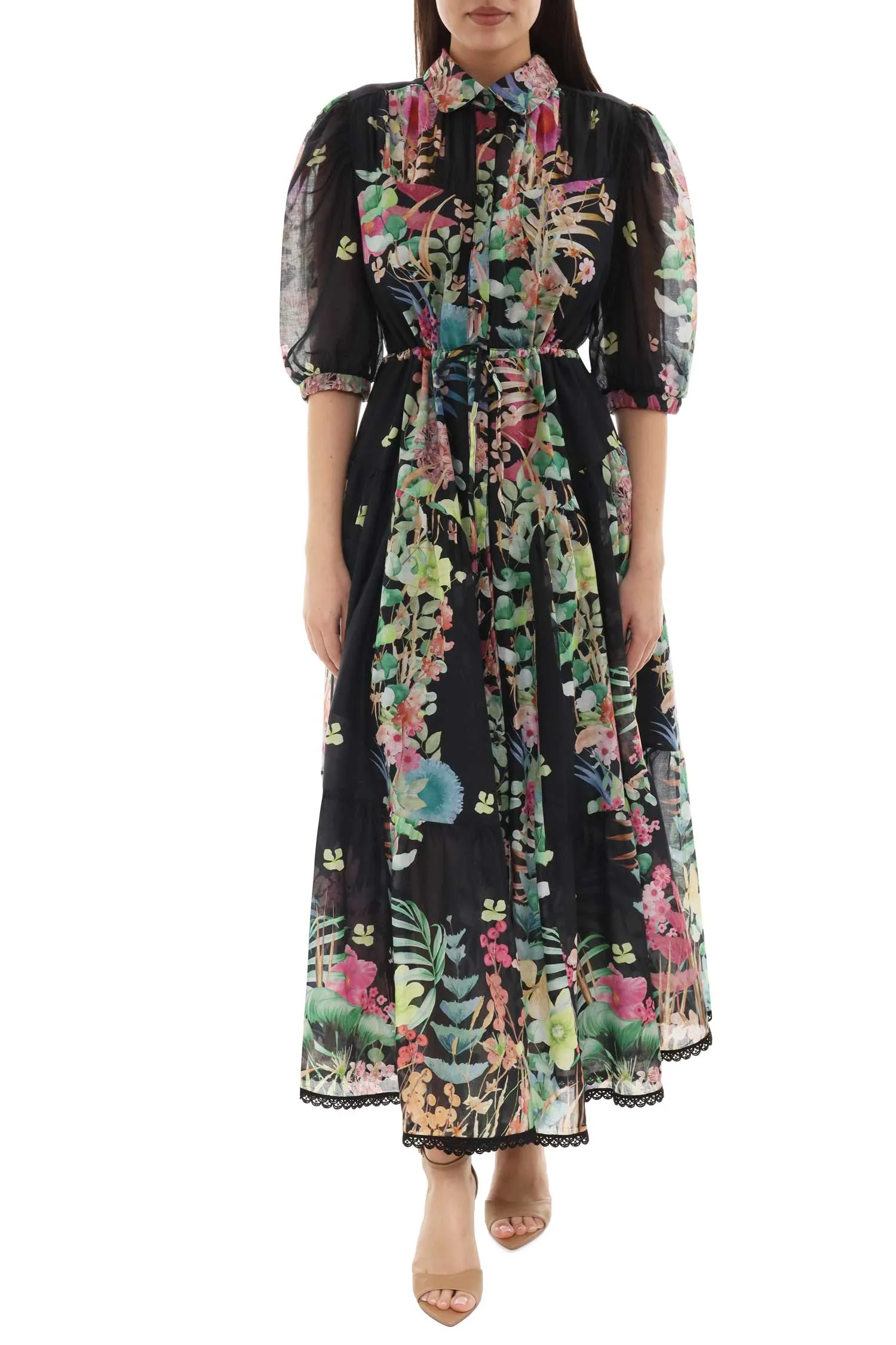ПЛАТЬЕ-РУБАШКА CRISELLE ЧЁРНО-ЗЕЛЁНО-РОЗОВОЕ, ПРИНТ ЦВЕТЫ, ДЛИННОЕ, ПОЯС НА КУЛИСКЕ, РУКАВА-ФОНАРИКИ