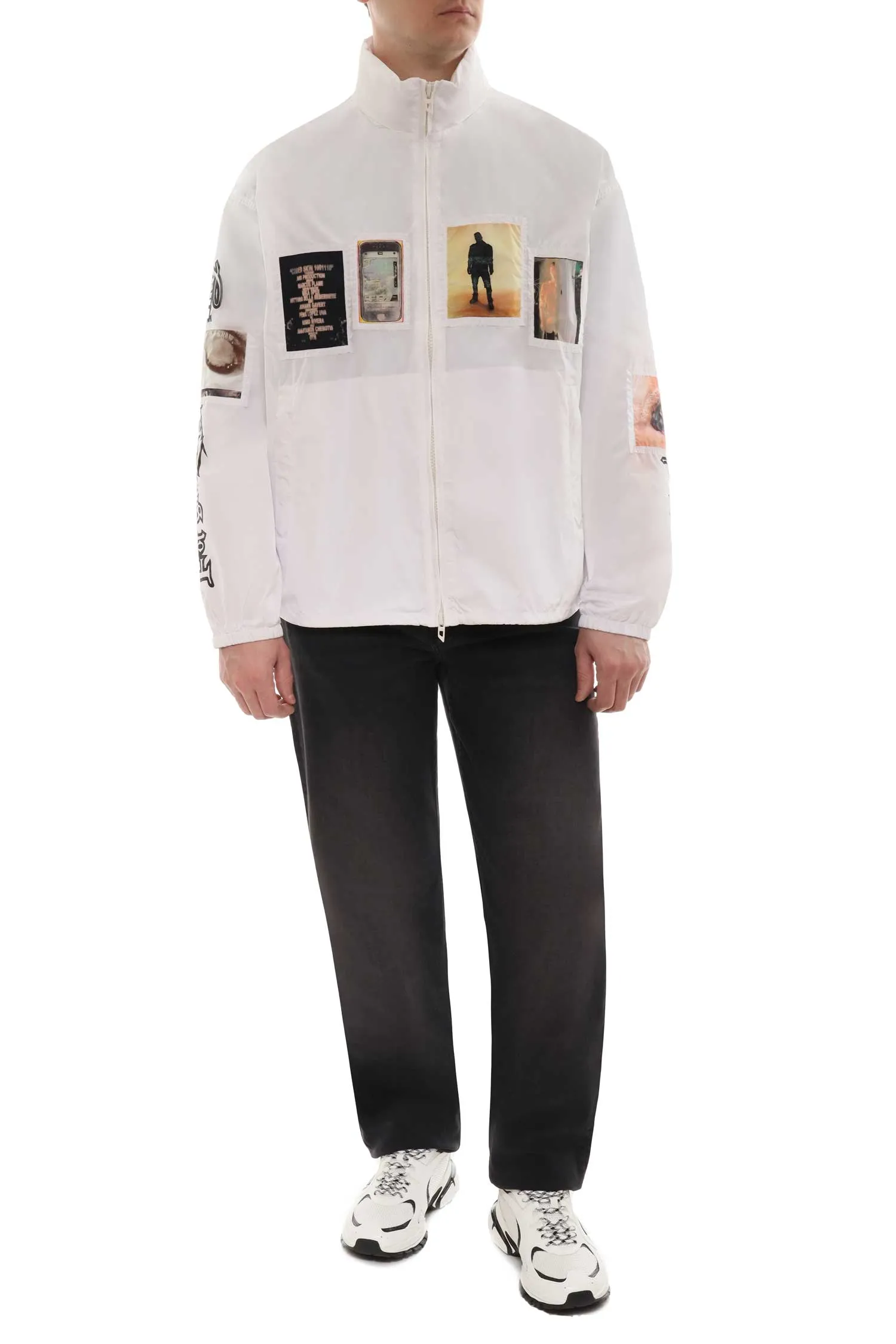 ВЕТРОВКА БЕЛАЯ, НА ГРУДИ И РУКАВАХ РАЗНОЦВЕТНЫЕ АППЛИКАЦИИ, СНИЗУ НА КУЛИСКЕ, ВОРОТ-СТОЙКА, КАПЮШОН