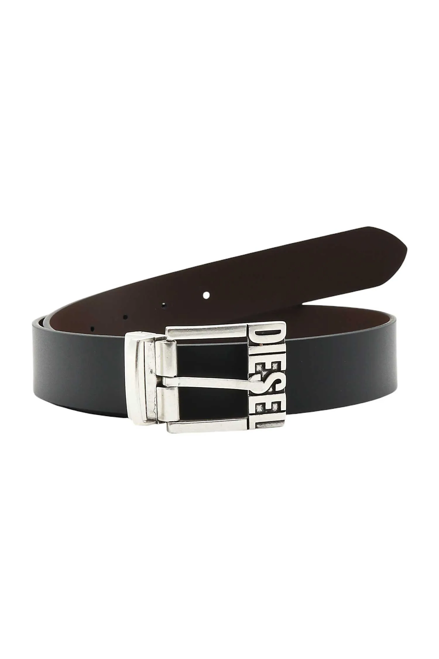 РЕМЕНЬ ЧЁРНЫЙ/КОРИЧНЕВЫЙ, ДВУСТОРОННИЙ, СЕРЕБР.ПРЯЖКА С ВЕРТИК.ЛОГО-НАДПИСЬЮ, Ш=3,4