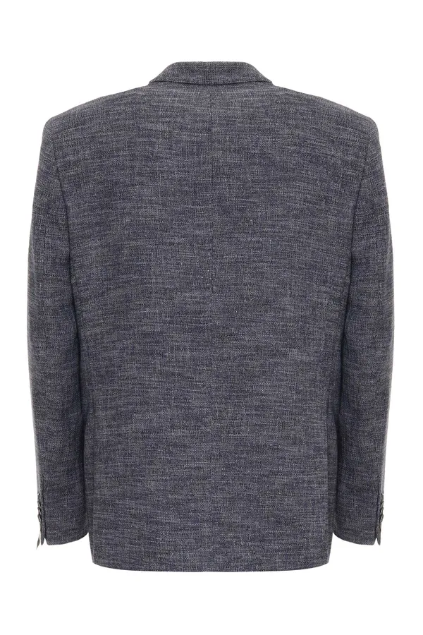 ПИДЖАК СИНЕ-БЕЛЫЙ МЕЛАНЖ, ЧЁРНОЕ МЕТАЛЛ.ЛОГО НА ЛАЦКАНЕ, КАРМАНЫ С КЛАПАНОМ, СЗАДИ РАЗРЕЗЫ
