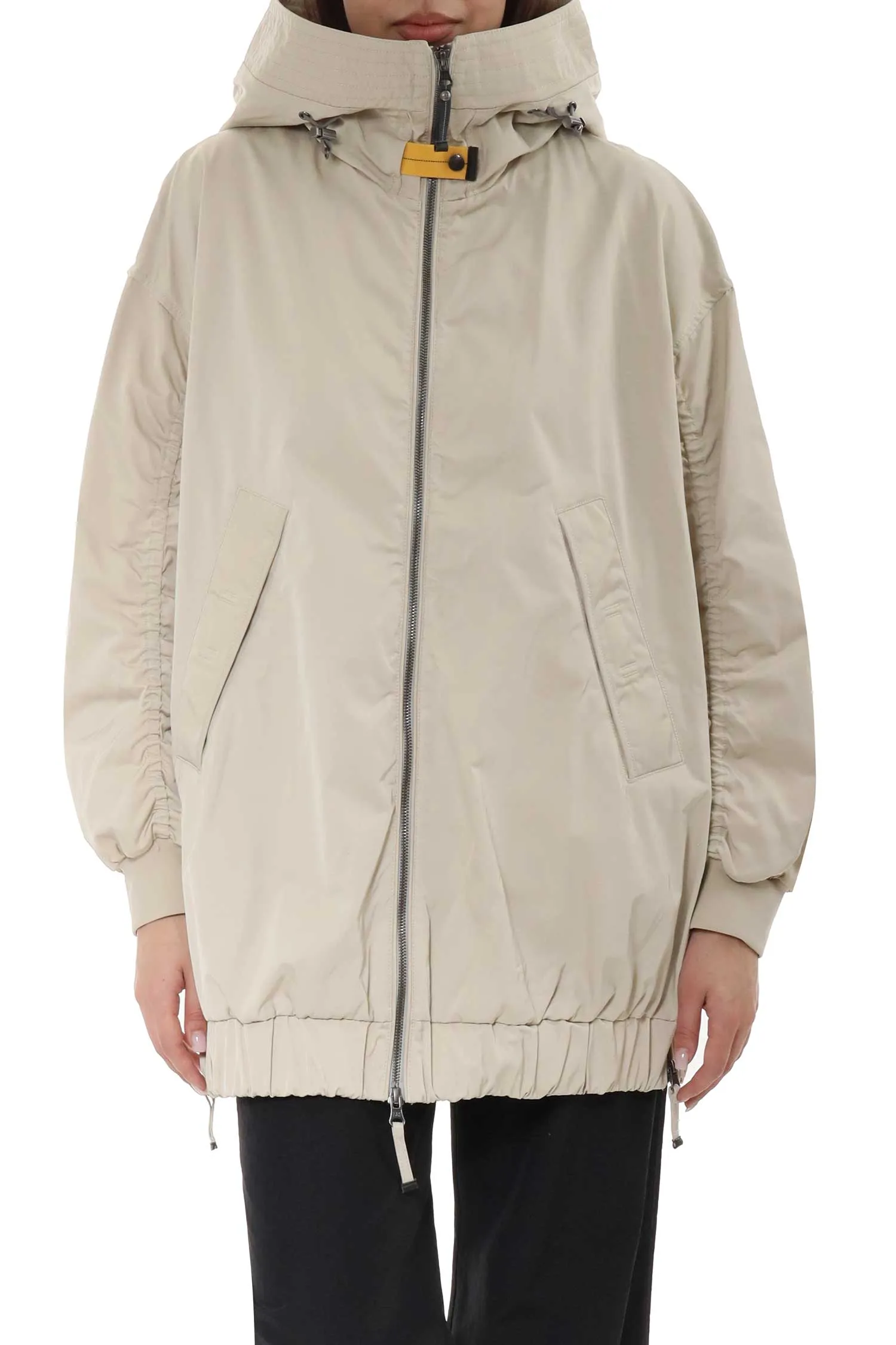 Ветровка выполнена из смесовой ткани на основе полиэстера и хлопка с подкладкой из полиамида и полиэстера — материал лёгкий, защищает от ветра и комфортен в носке. Удлинённый силуэт и капюшон формируют практичную основу, боковые молнии добавляют вариативности и свободы движения. Присборенные рукава смягчают линии и придают модели динамику, сохраняя баланс между утилитарностью и более выразительной формой.
