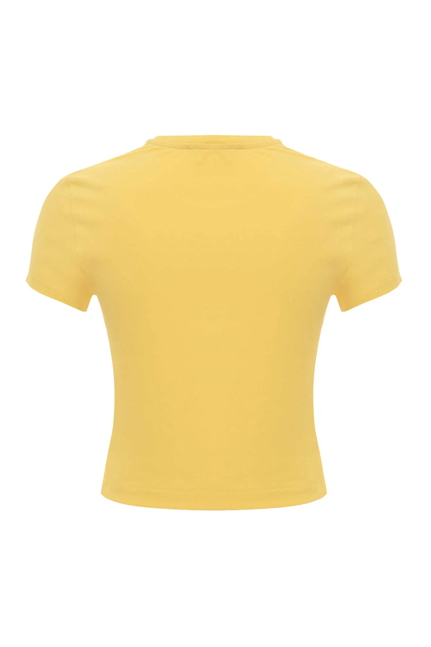 ФУТБОЛКА ЖЁЛТАЯ, УКОРОЧЕННАЯ, НА ГРУДИ БАРХАТНАЯ КРАСНАЯ ЛОГО-НАДПИСЬ