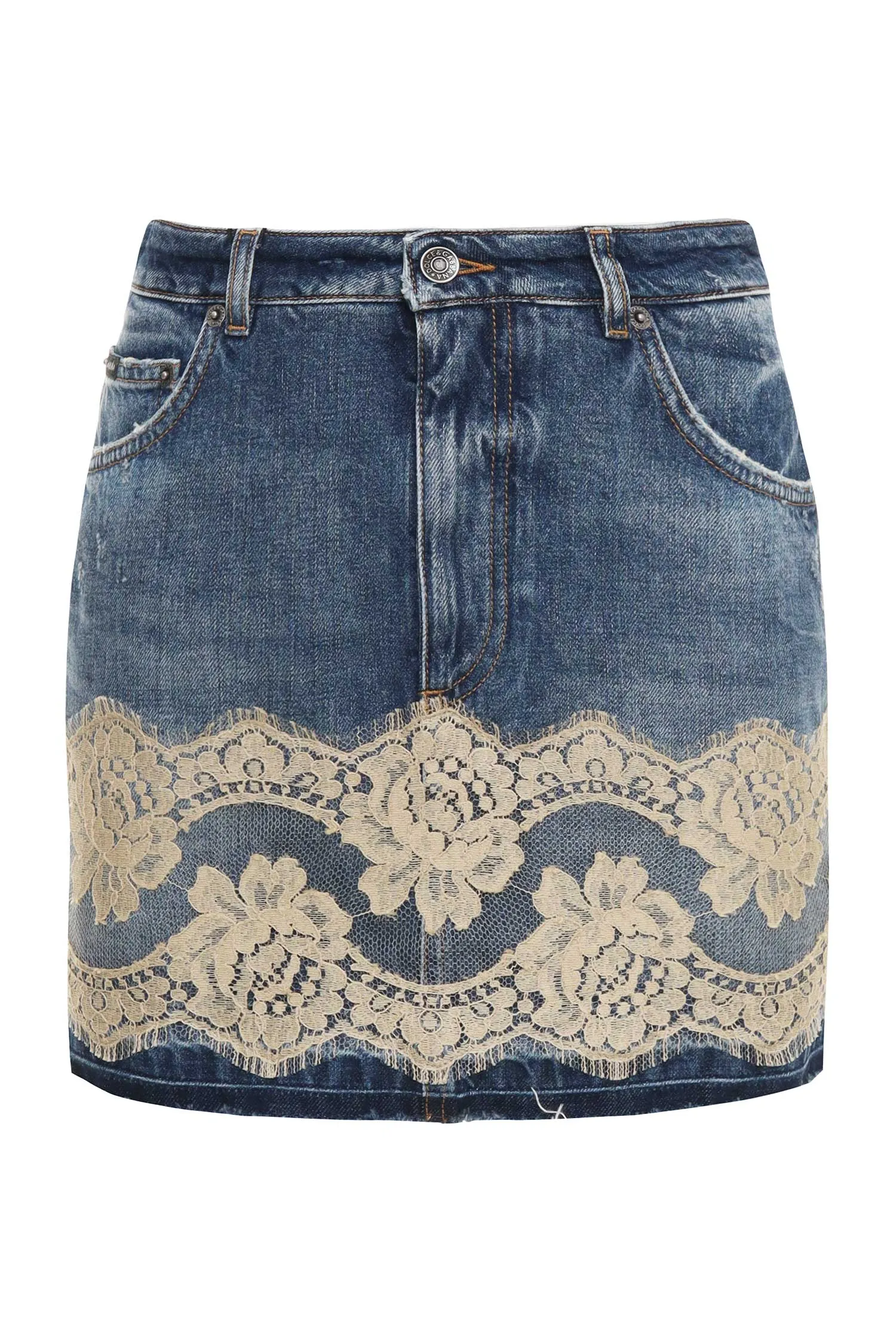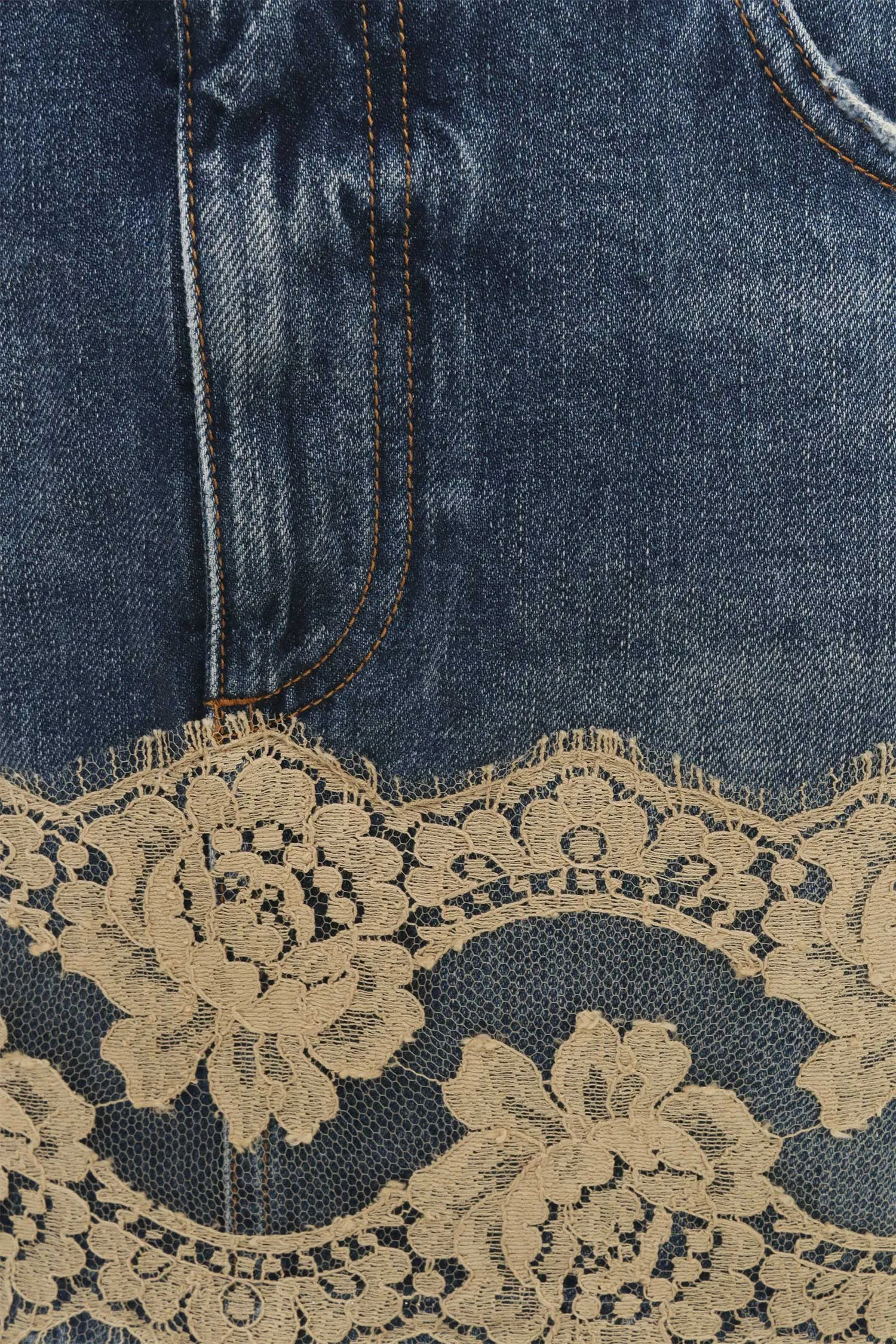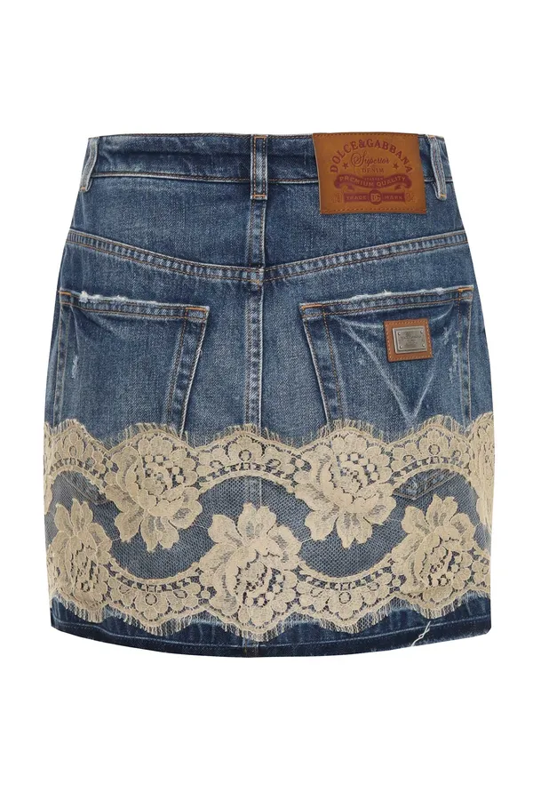 ЮБКА СИНЯЯ, ДЖИНСОВАЯ, КОРОТКАЯ, ОТД.БЕЖЕВЫМ КРУЖЕВОМ, НЕОБРАБОТАННЫЕ КРАЯ