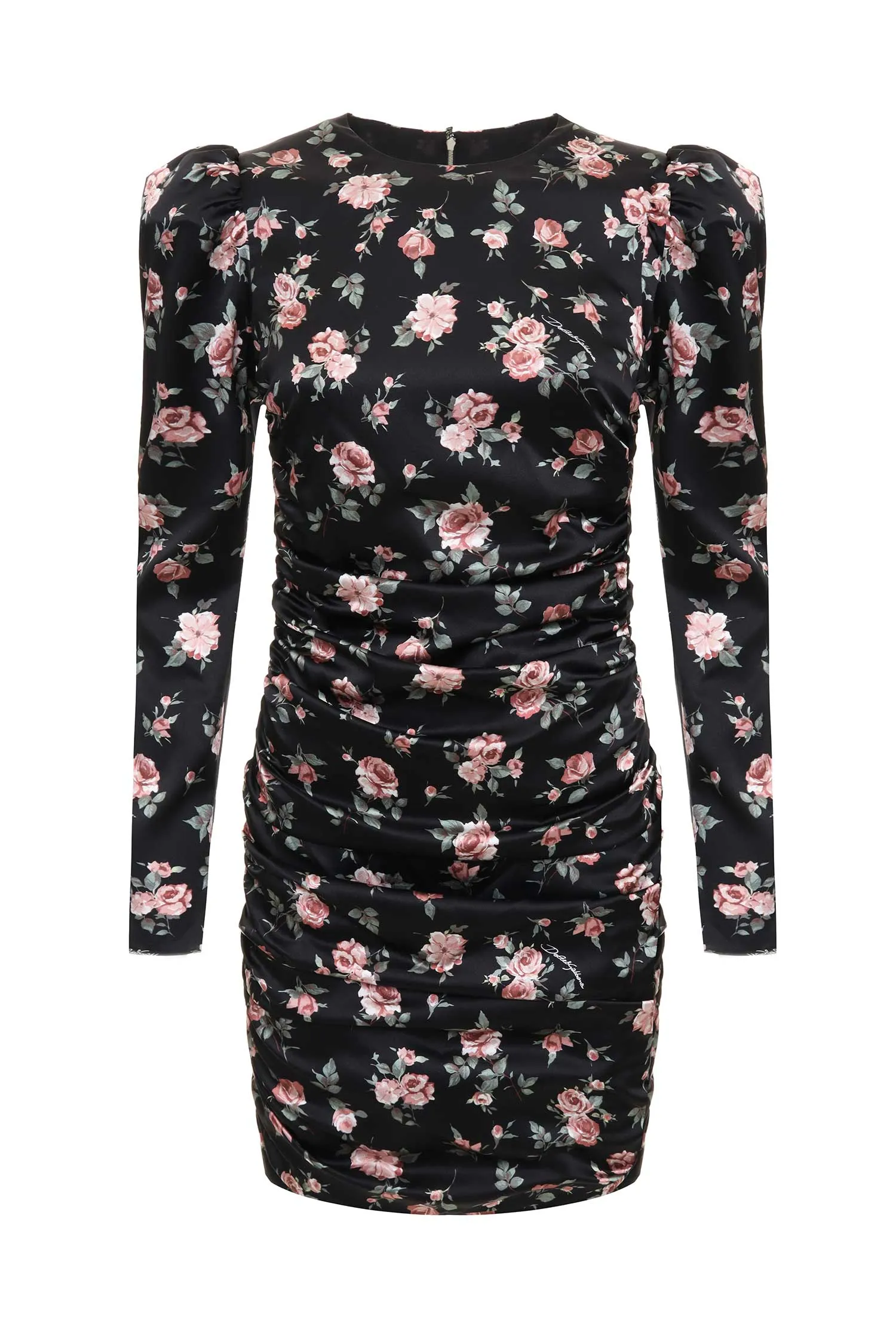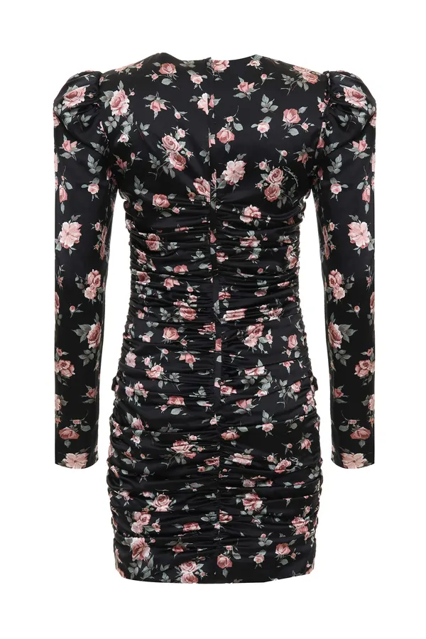 ПЛАТЬЕ ЧЁРНОЕ ИЗ ШЁЛКА, ПРИНТ РОЗОВЫЕ РОЗЫ, КОРОТКОЕ, СБОКУ ПРИСБОРЕННОЕ, СЗАДИ НА МОЛНИИ, ДЛ/РУК.