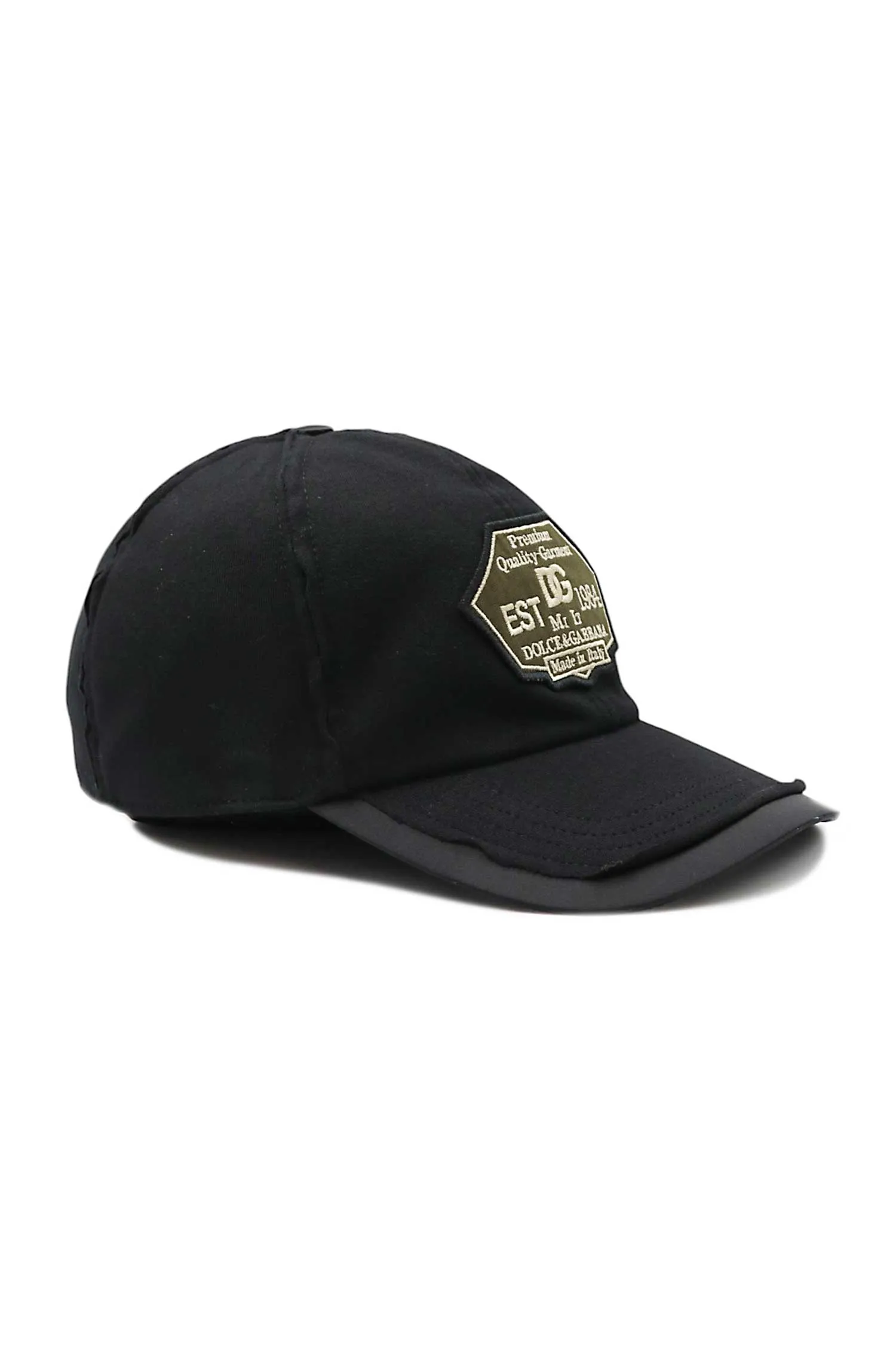БЕЙСБОЛКА ЧЁРНАЯ, СПЕРЕДИ ОЛИВКОВАЯ НАШИВКА С НАДПИСЯМИ, НЕОРАБОТАННЫЕ КРАЯ, АТЛАСНЫЙ КОЗЫРЁК