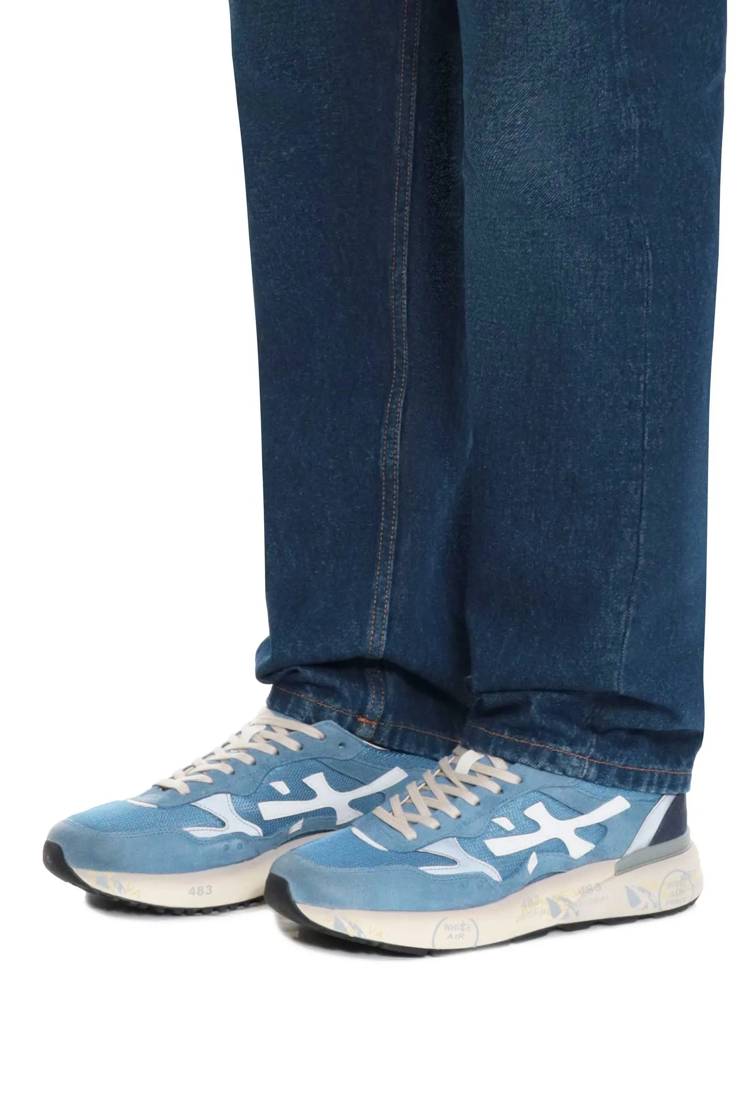 PREMIATA КРОССОВКИ MICK Т/ГОЛУБЫЕ КОМБИНИР., СЕТКА+ЗАМША, СЕРЫЕ ВСТАВКИ, СБОКУ БЕЛОЕ ЛОГО, МОЛОЧНАЯ ПОДКЛАДКА, К=3,5