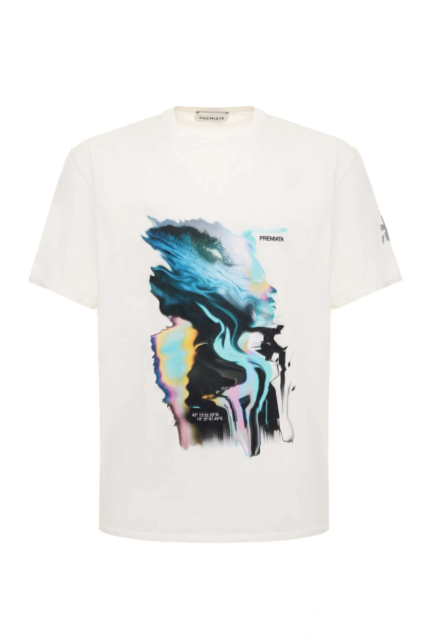 ФУТБОЛКА БЕЛАЯ, НА ГРУДИ РАЗНОЦВЕТНЫЙ РИСУНОК-ГРАФФИТИ