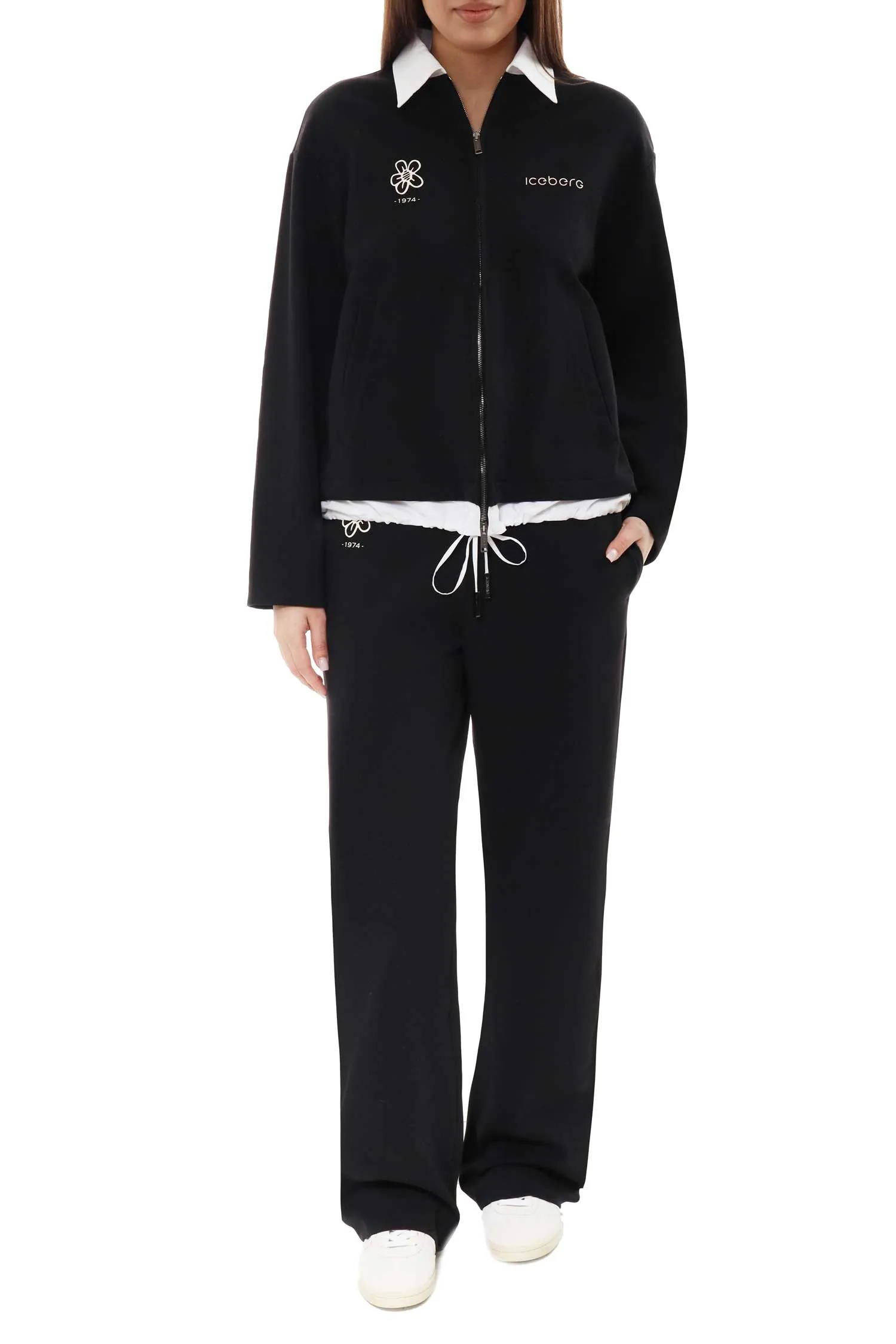 КОСТЮМ ЧЁРНЫЙ, ОЛИМПИЙКА С БЕЛЫМ ВОРОТНИКОМ+ШТАНЫ СВОБОДНЫЕ С ДВОЙНЫМ ПОЯСОМ, НА ГРУДИ БЕЛАЯ ЛОГО-НАДПИСЬ