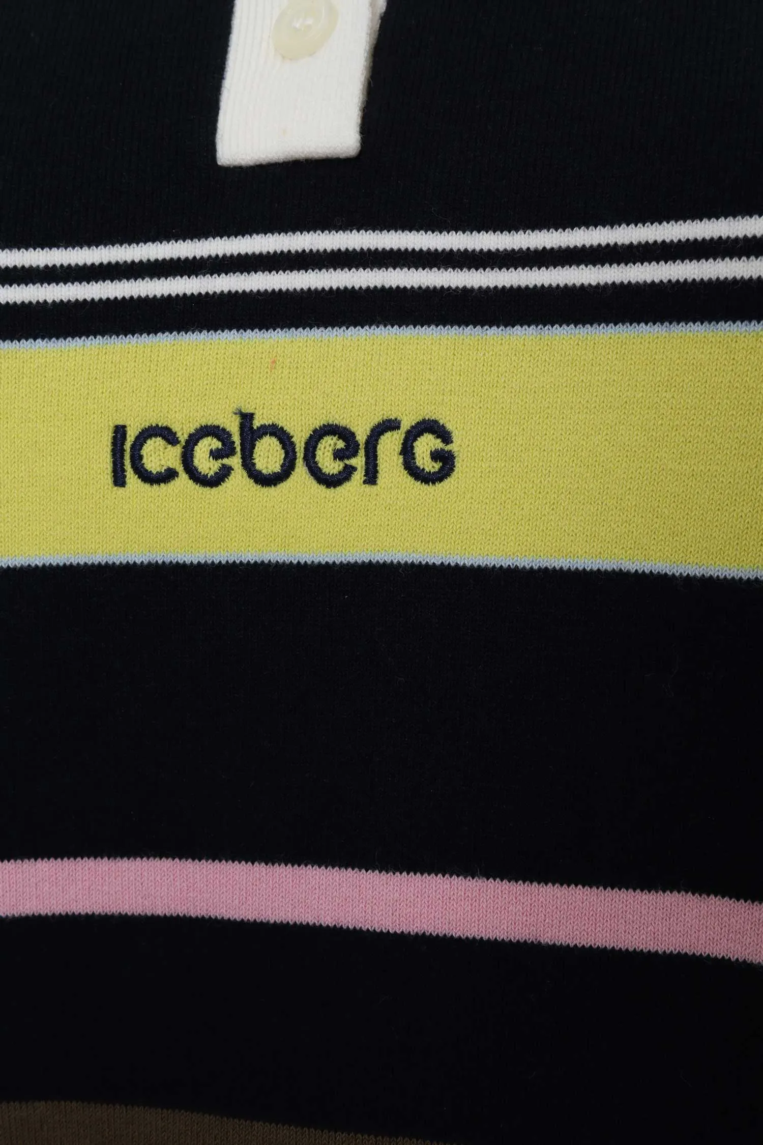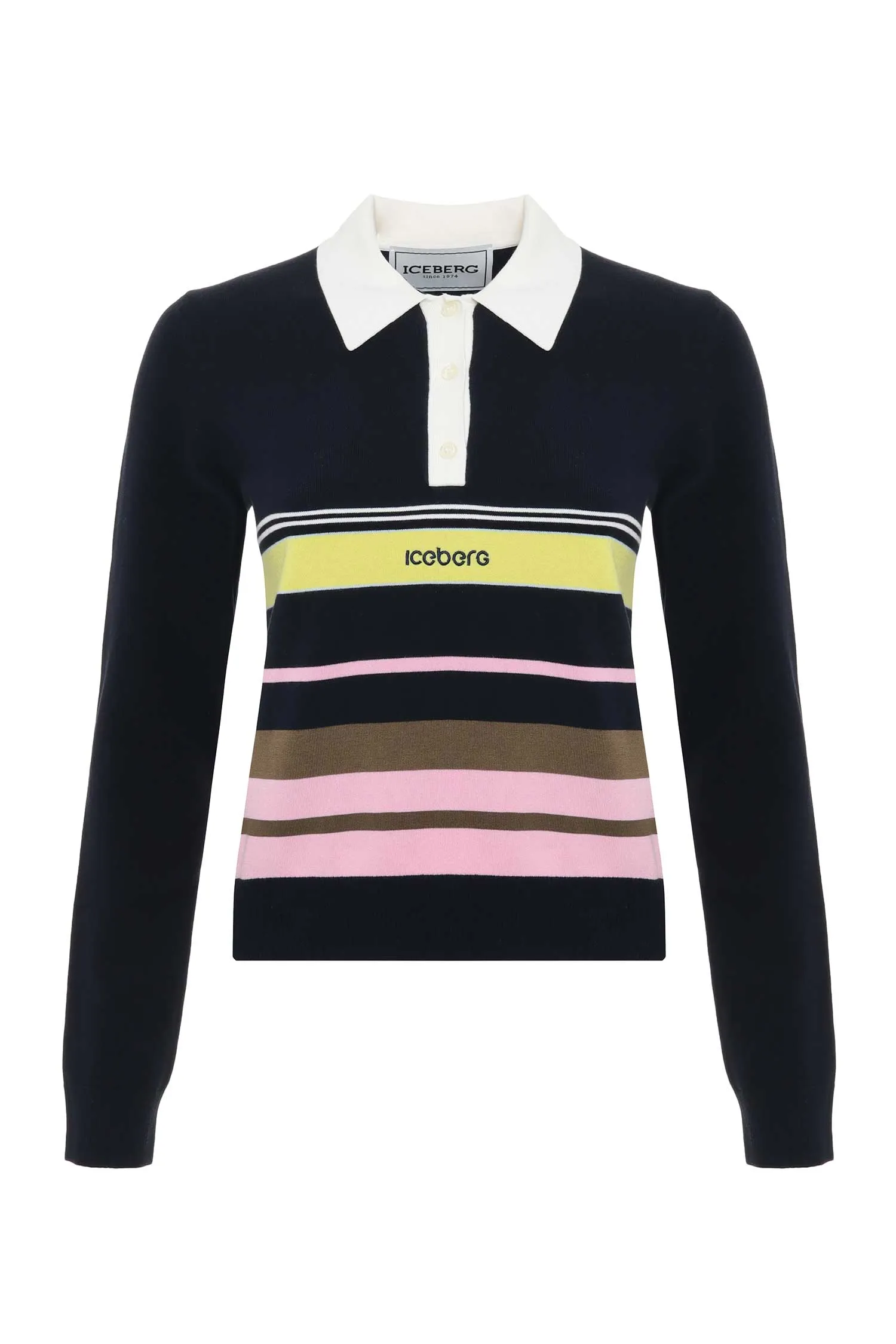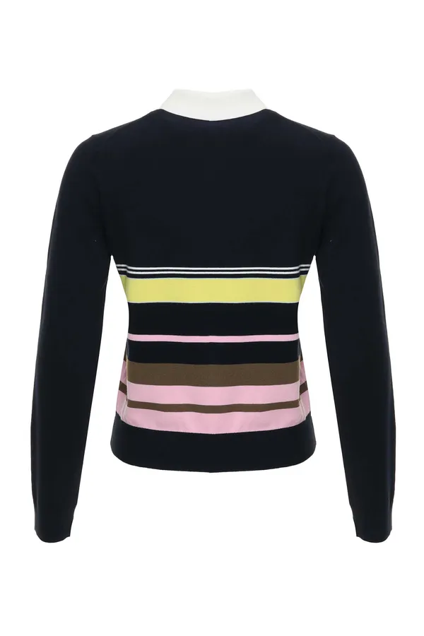 ДЖЕМПЕР-ПОЛО Т/СИНИЙ С ЖЁЛТЫМИ/РОЗОВЫМИ ПОЛОСАМИ, БЕЛЫЙ ВОРОТНИК, ДЛ/РУК.
