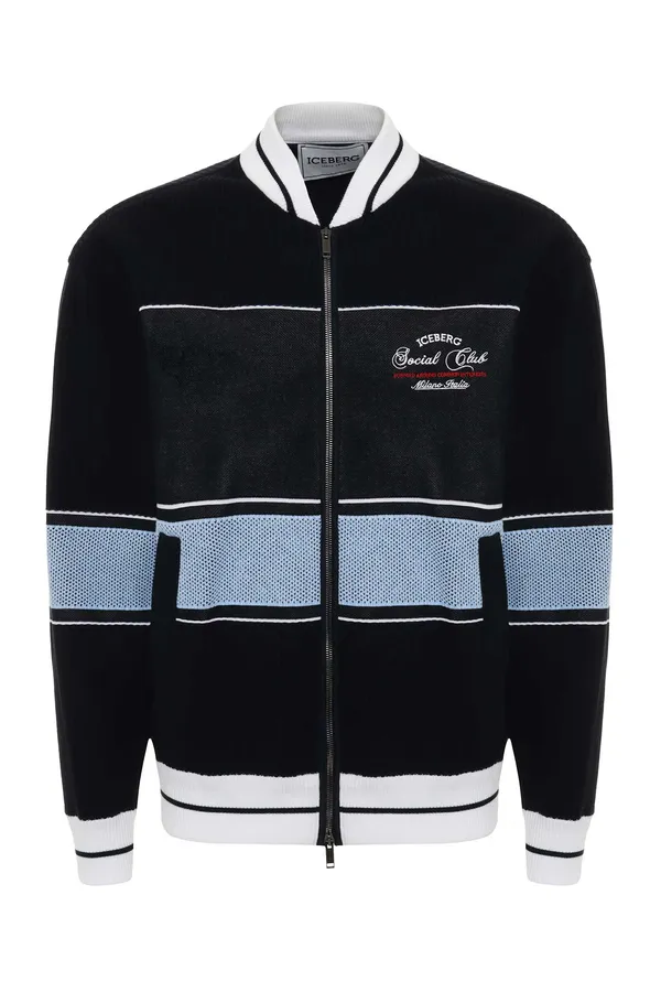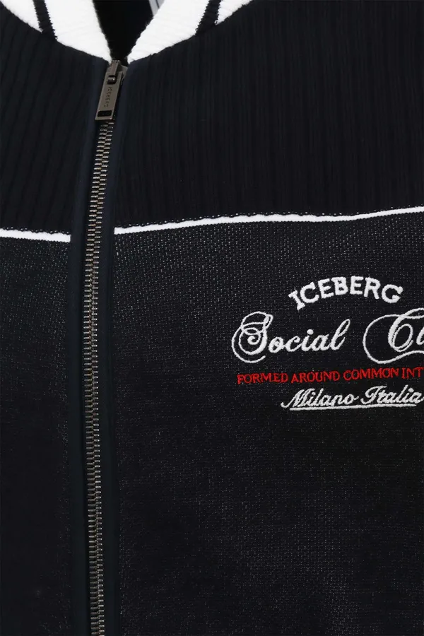 ICEBERG КАРДИГАН-БОМБЕР Т/СИНИЙ, ШИРОКАЯ ГОЛУБАЯ ПОЛОСА, НА СПИНЕ БЕЛОЕ ЛОГО И НАДПИСИ, БЕЛЫЙ ВОРОТНИК И МАНЖЕТЫ