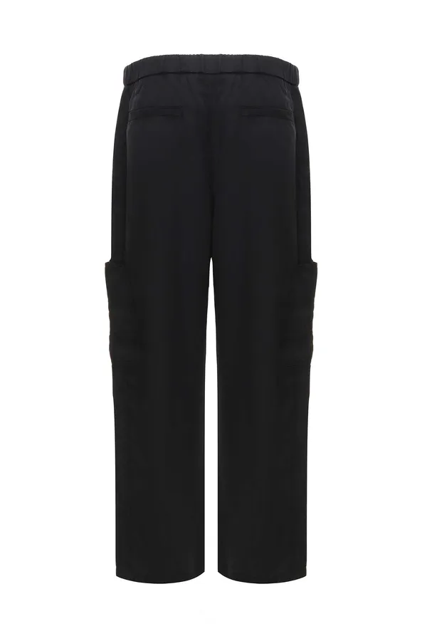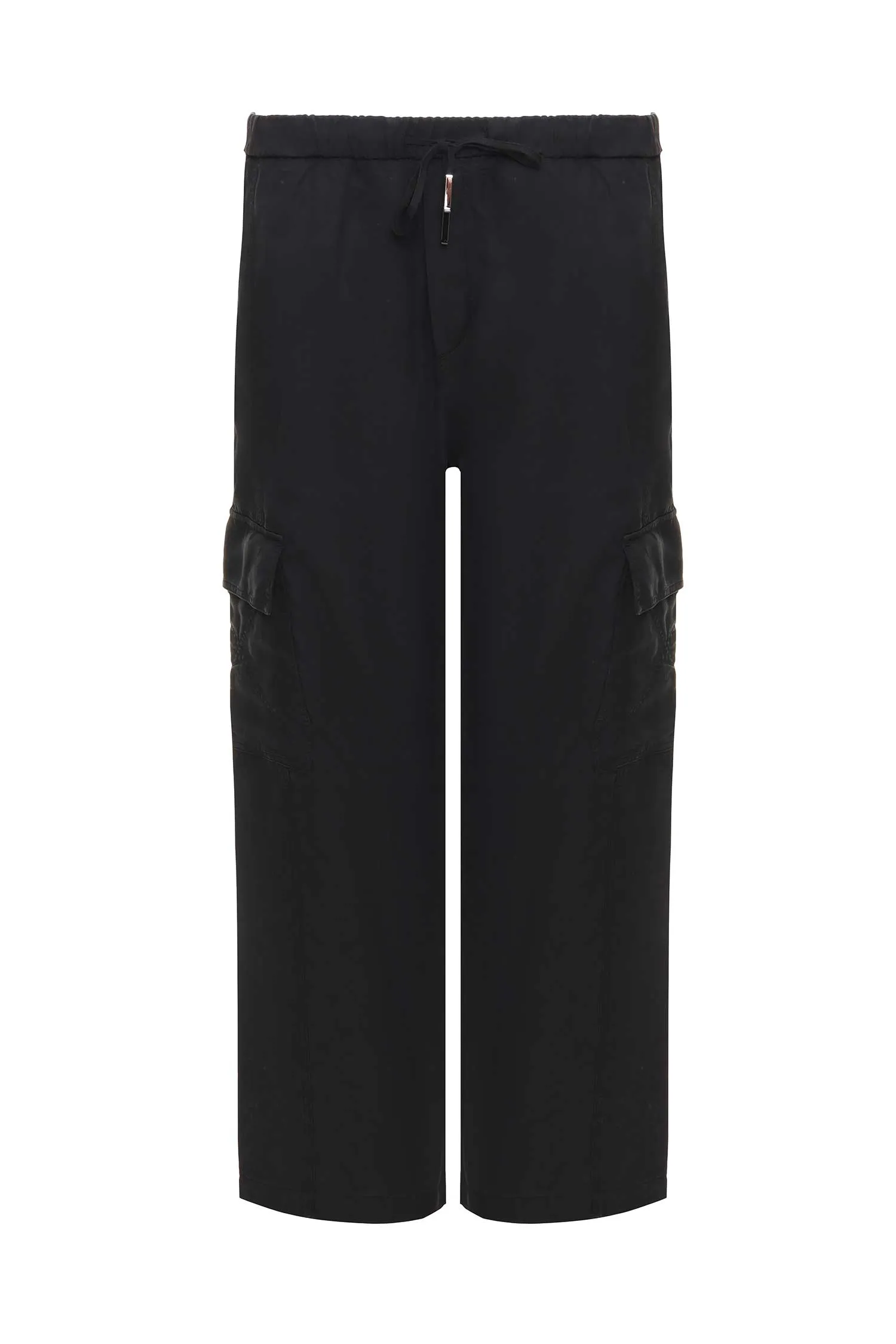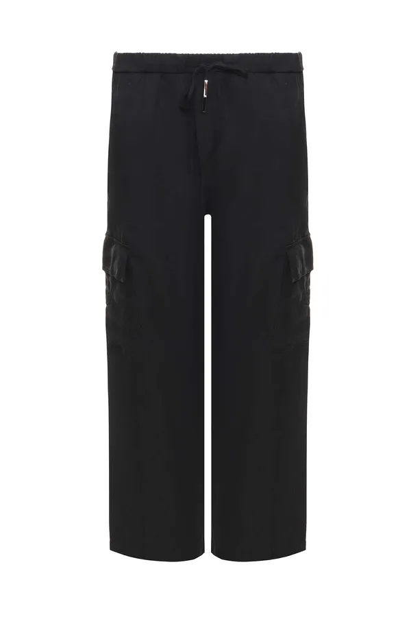 БРЮКИ ЧЁРНЫЕ, ТОНКИЕ, НА КУЛИСКЕ, ПОЯС НА РЕЗИНКЕ, СБОКУ НАКЛАДНЫЕ КАРМАНЫ