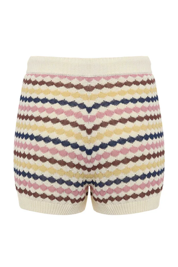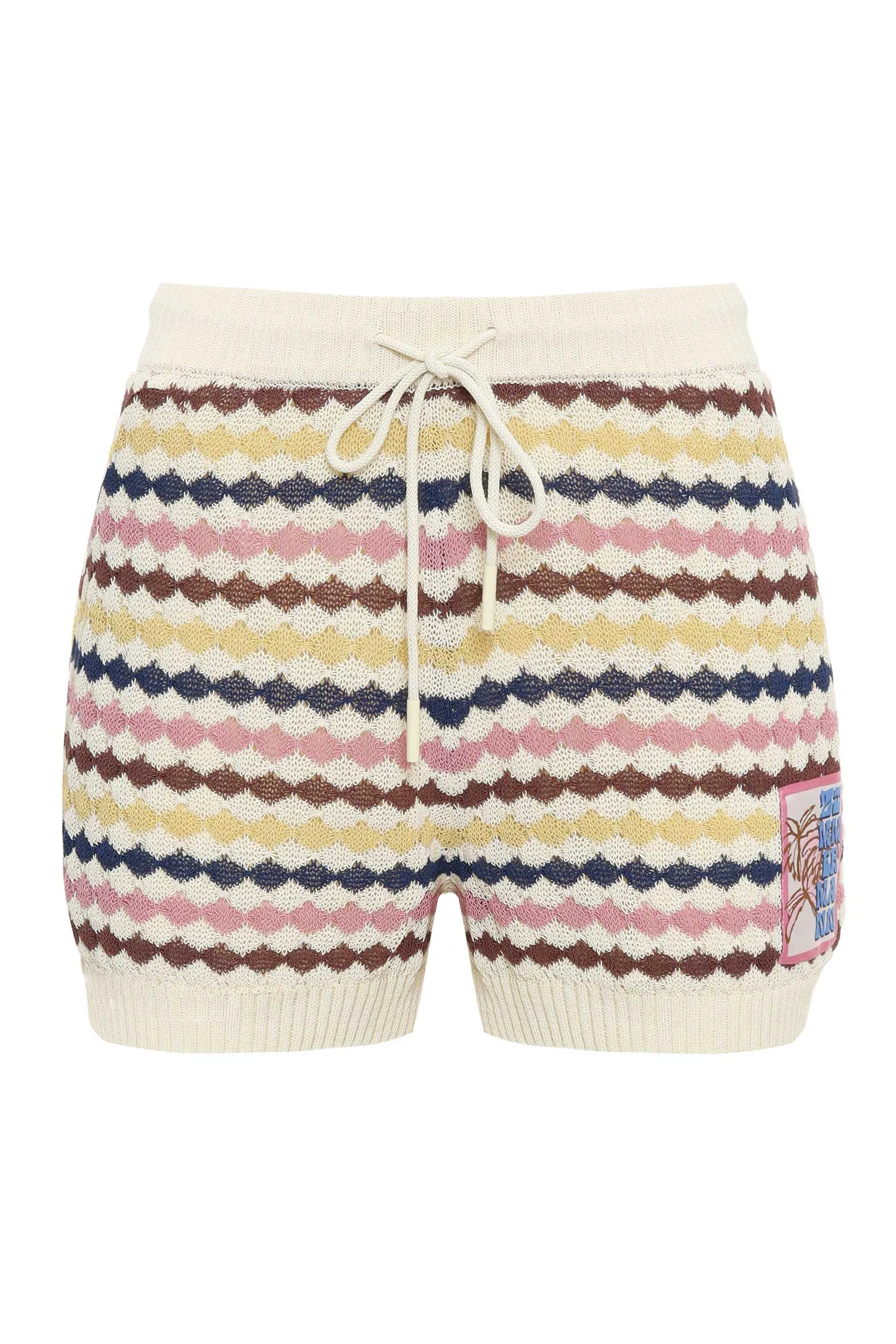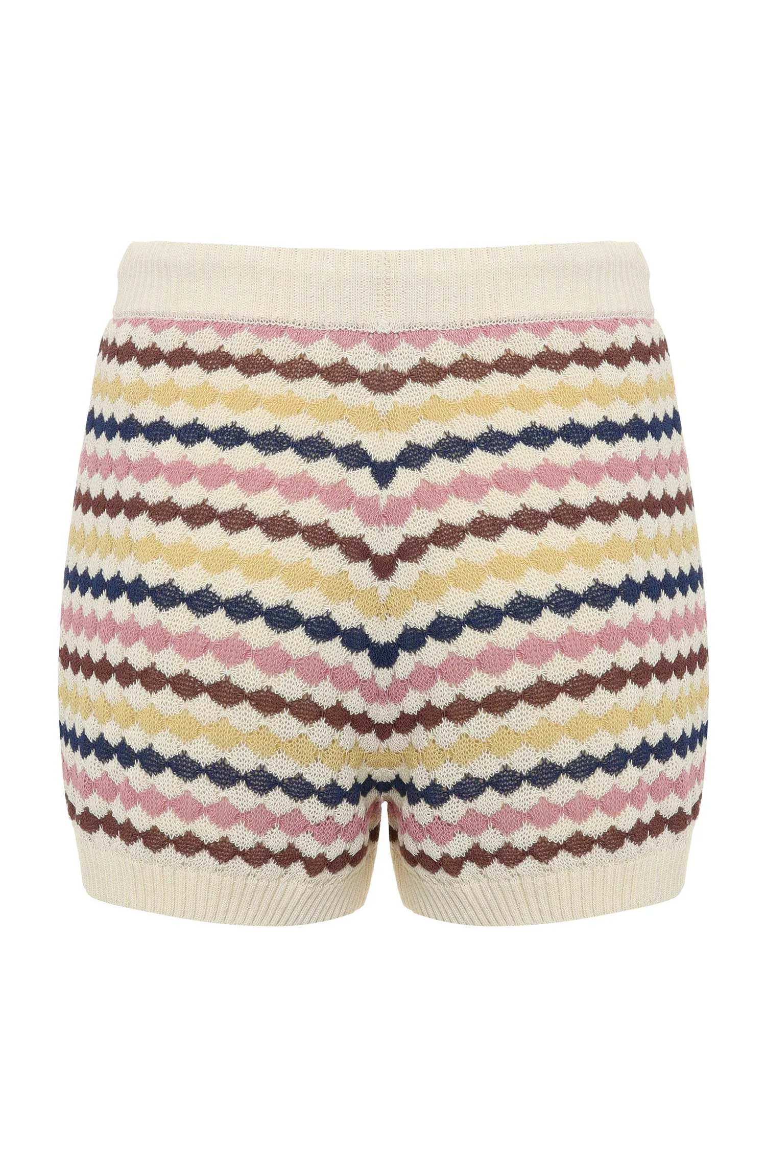 ШОРТЫ БЕЖЕВЫЕ В РАЗНОЦВЕТНУЮ ПОЛОСКУ, АЖУРНАЯ ВЯЗКА, НА КУЛИСКЕ, СБОКУ НАШИВКА-ЛОГО