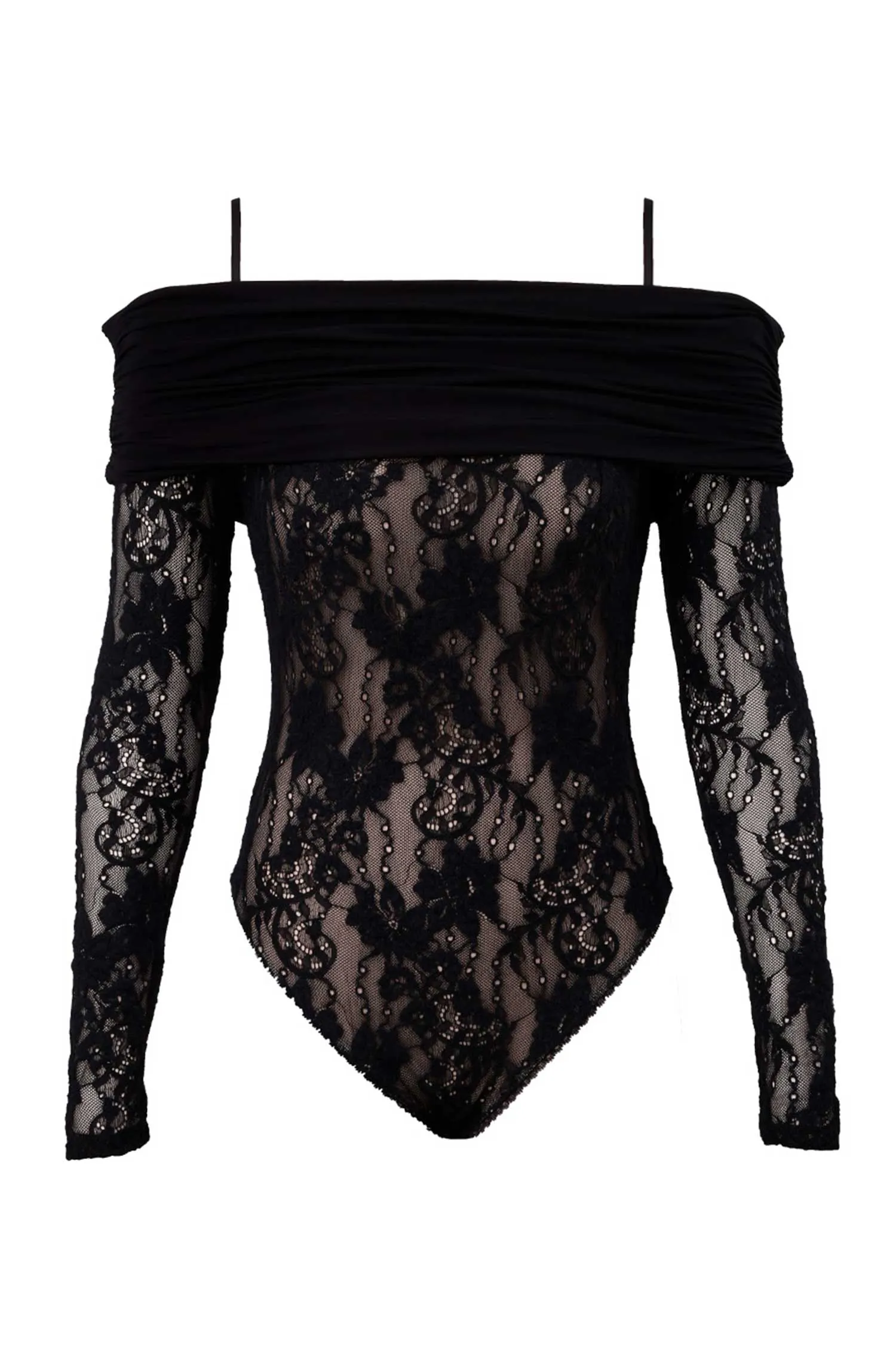БОДИ ЧЁРНОЕ ИЗ ЭЛАСТИЧНОГО КРУЖЕВА, ПРИСБОРЕННАЯ ВСТАВКА НА ПЛЕЧАХ, СЪЁМНЫЕ БРЕТЕЛЬКИ, ОТКРЫТЫЕ ПЛЕЧИ, ДЛ/РУК.