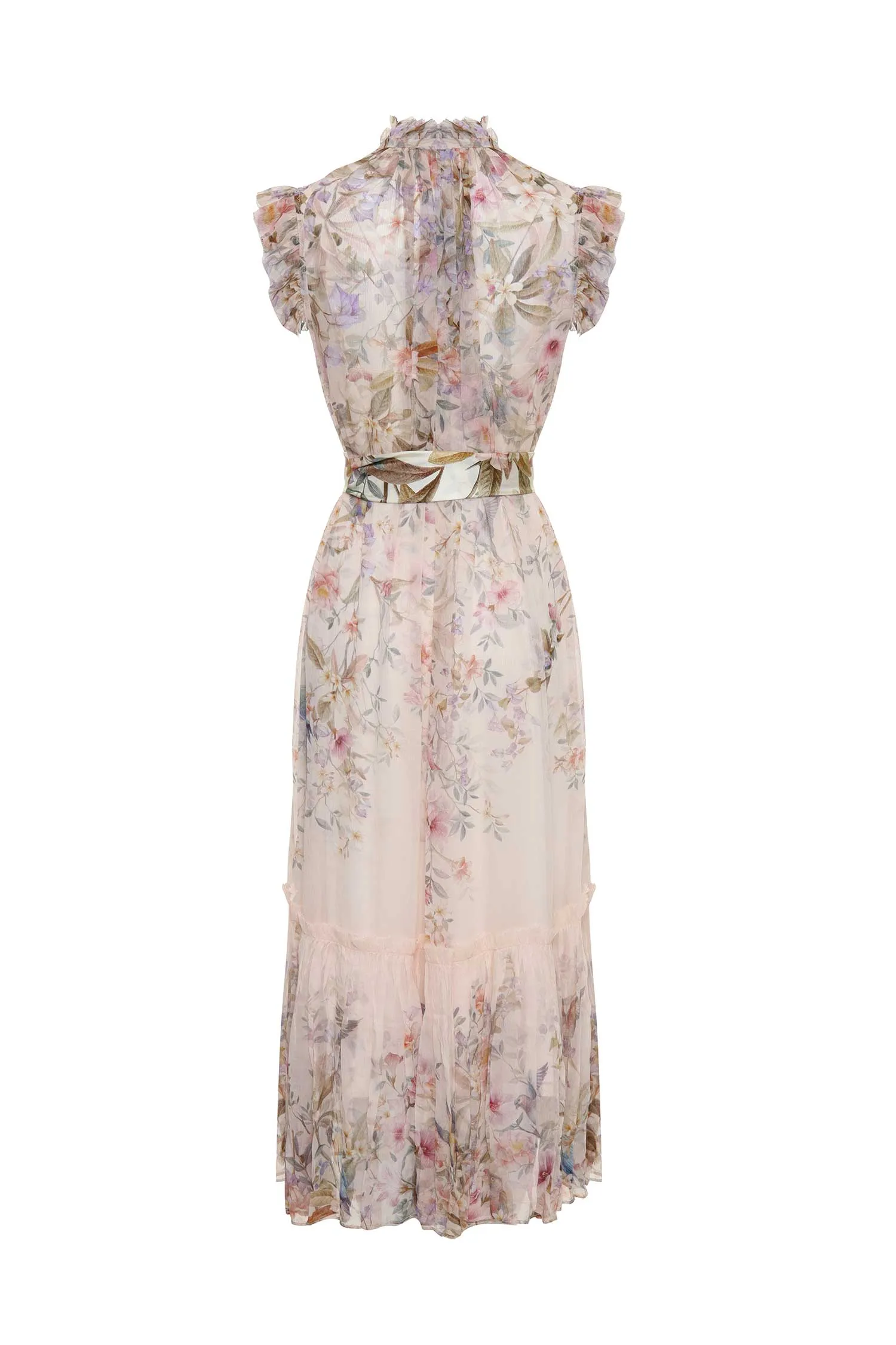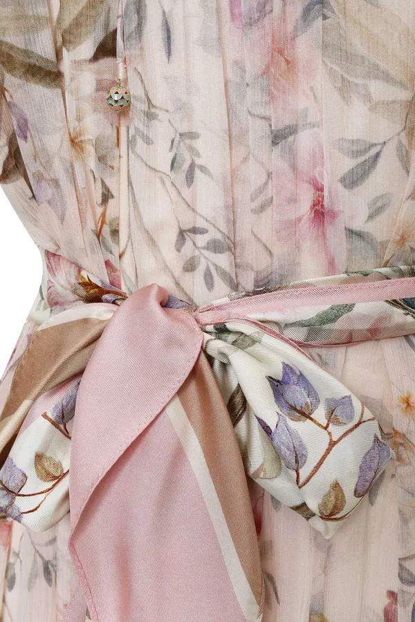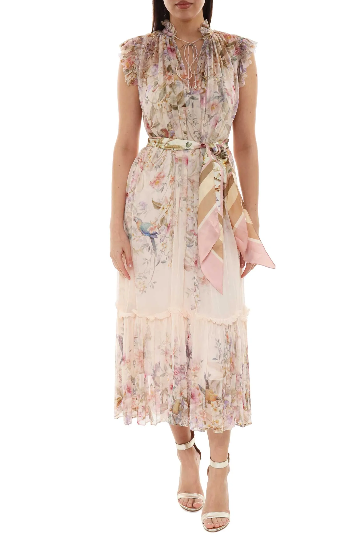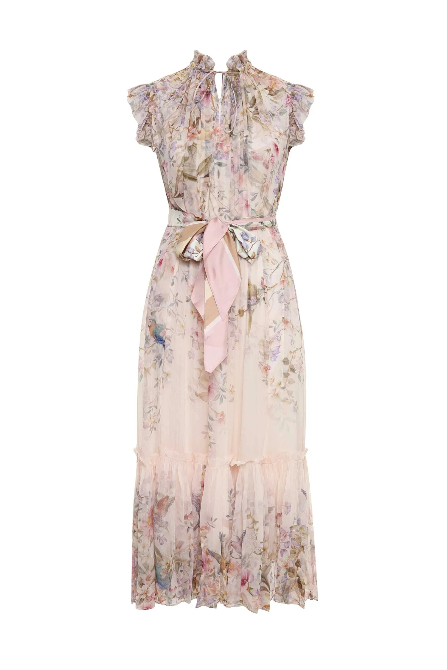 ПЛАТЬЕ РОЗОВО-МОЛОЧНО-СИРЕНЕВОЕ ИЗ ШИФОНА, ПРИНТ ЦВЕТЫ И ПТИЦЫ, ДЛИННОЕ, ВОРОТ НА ЗАВЯЗКАХ, СОРОЧКА, ПОЯС, Б/РУК.