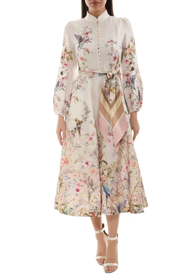 ПЛАТЬЕ-РУБАШКА МОЛОЧНОЕ ЛЁН, ПРИНТ ЦВЕТЫ И ПТИЦЫ, ДЛИННОЕ, ПОЯС ИЗ ШЁЛКА, БОКОВЫЕ КАРМАНЫ, ДЛ/РУК.