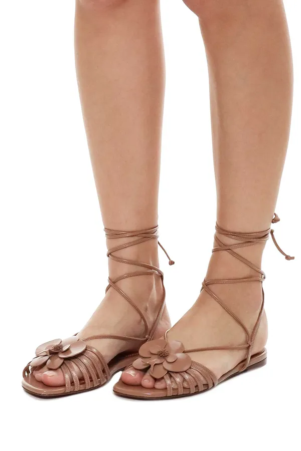 САНДАЛИИ ORCHID БЕЖЕВЫЕ С ЦВЕТКОМ, КОЖАНЫЕ, КВАДРАТНЫЙ НОС, ШНУРОВКА, К=0,8