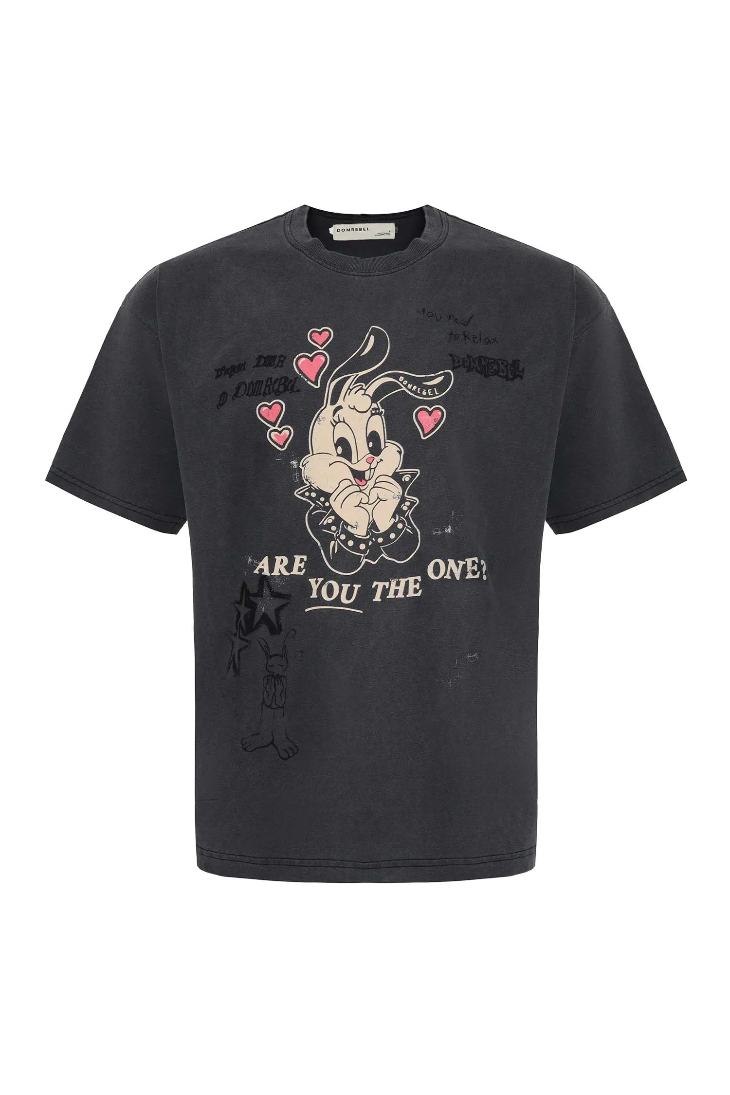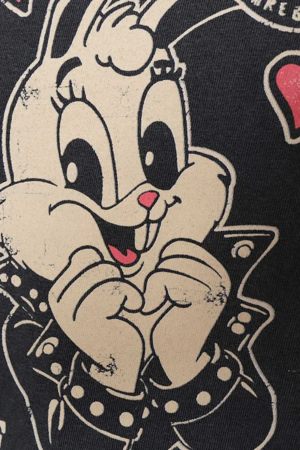 ФУТБОЛКА THE ONE ЧЁРНАЯ ВИНТАЖ, НА ГРУДИ И СПИНЕ РИС. КРОЛИК И РОЗОВЫЕ СЕРДЦА