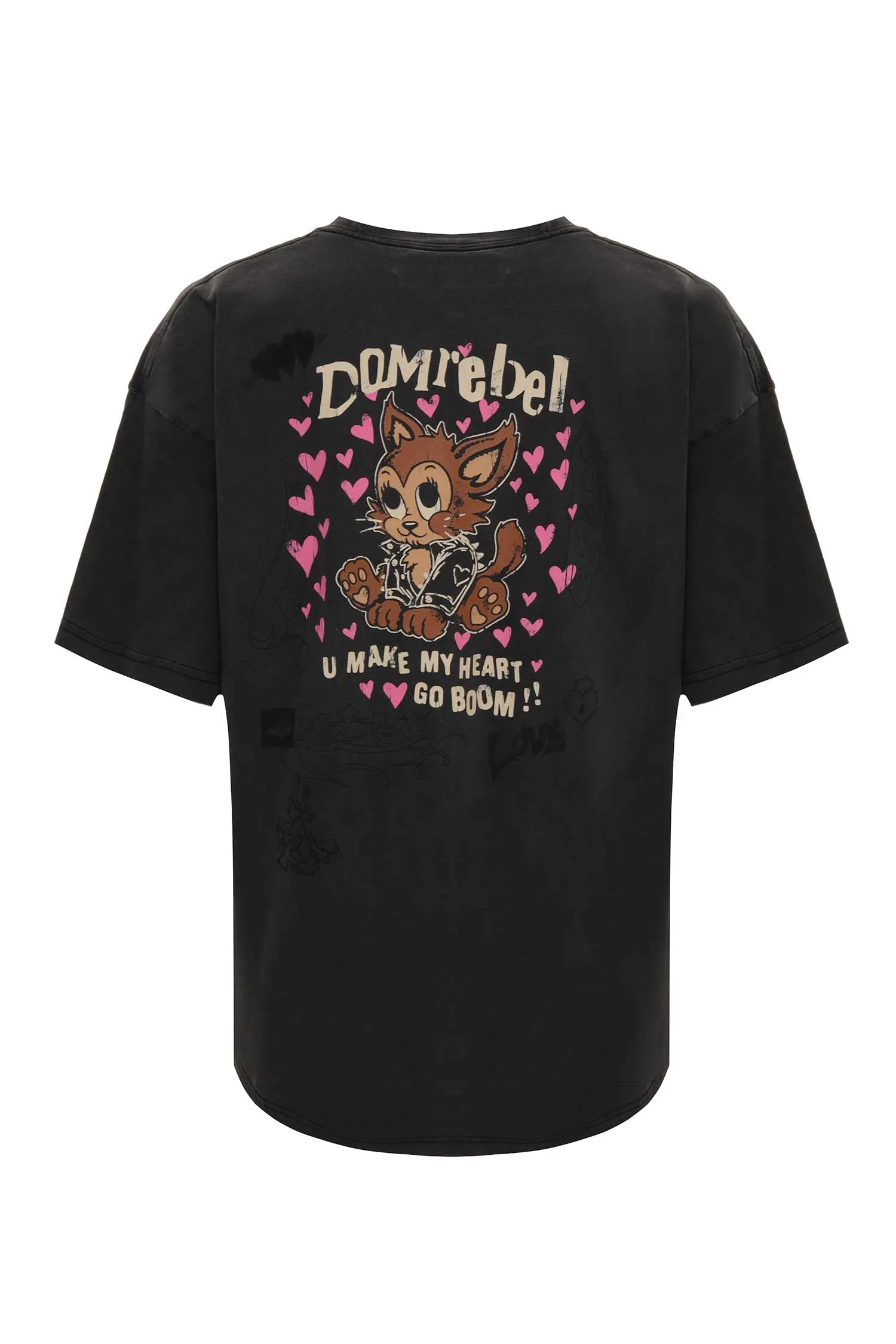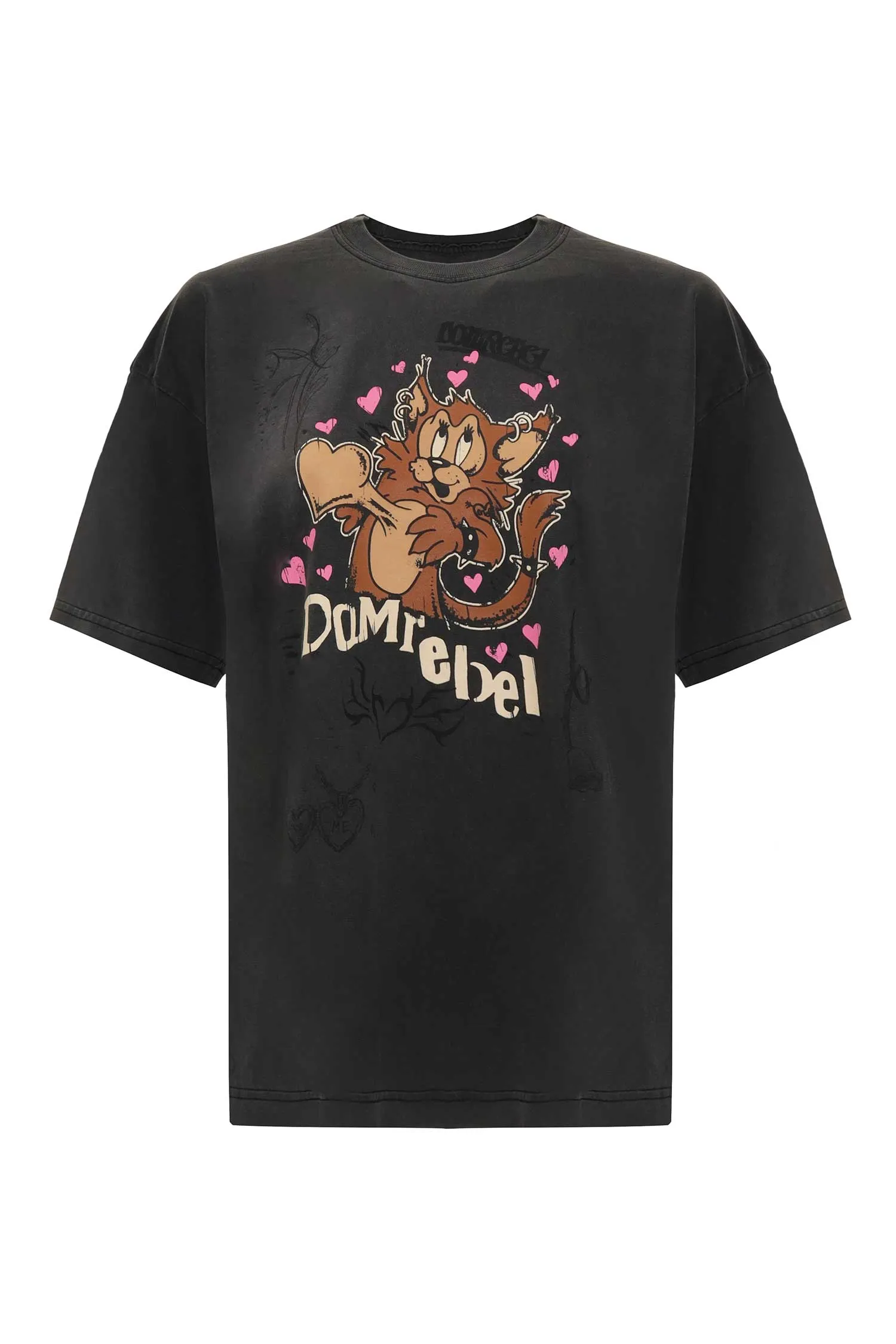 DOM REBEL ФУТБОЛКА BOOM Т/СЕРАЯ ВИНТАЖ, НА ГРУДИ РИС.КОТЁНОК И РОЗОВЫЕ СЕРДЕЧКИ