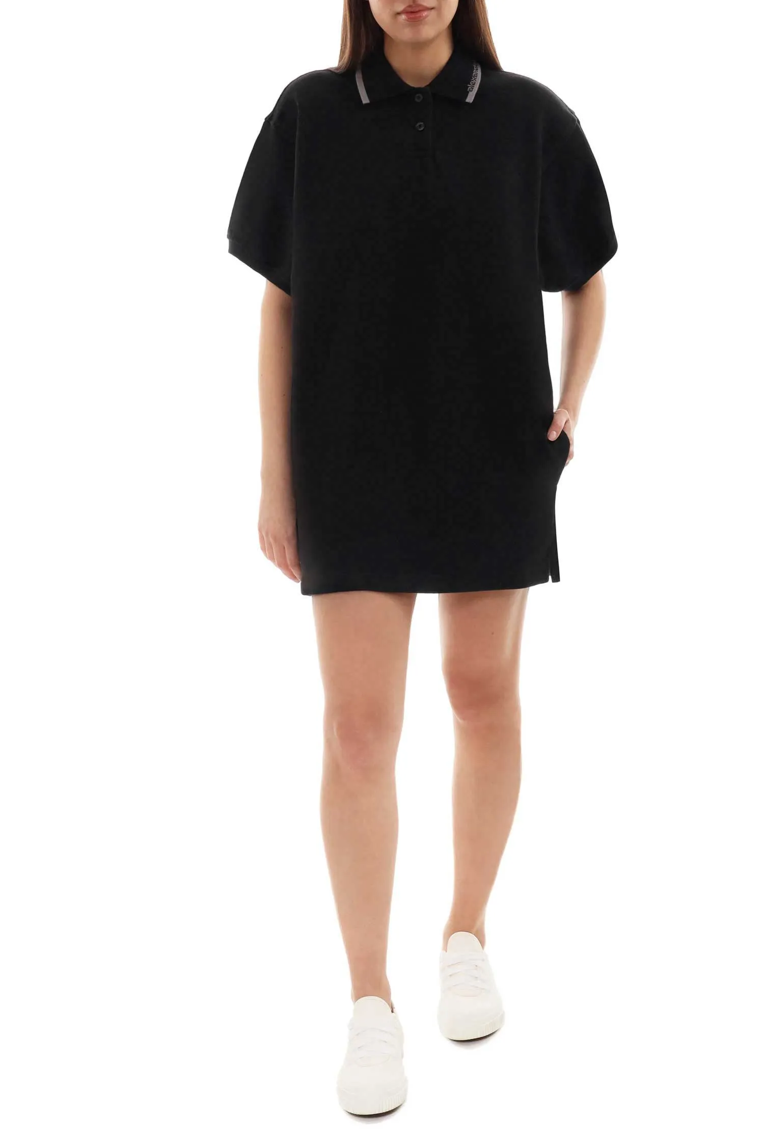 ПЛАТЬЕ-ПОЛО ЧЁРНОЕ, КОРОТКОЕ, НА ВОРОТНИКЕ СЕРАЯ ПОЛОСА С ЛОГО-НАДПИСЬЮ, КАРМАНЫ, К/РУК.