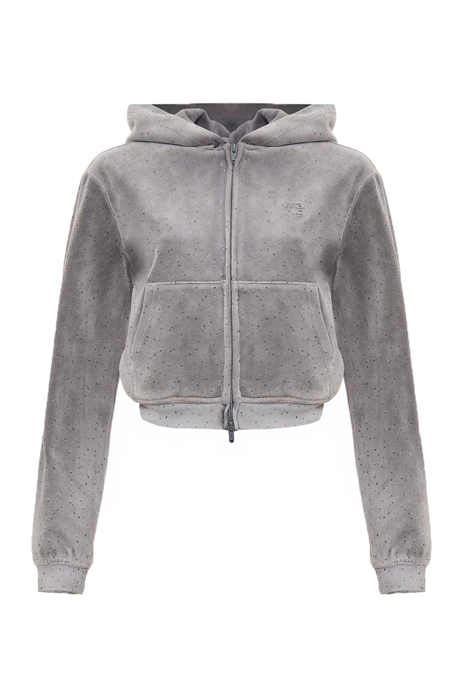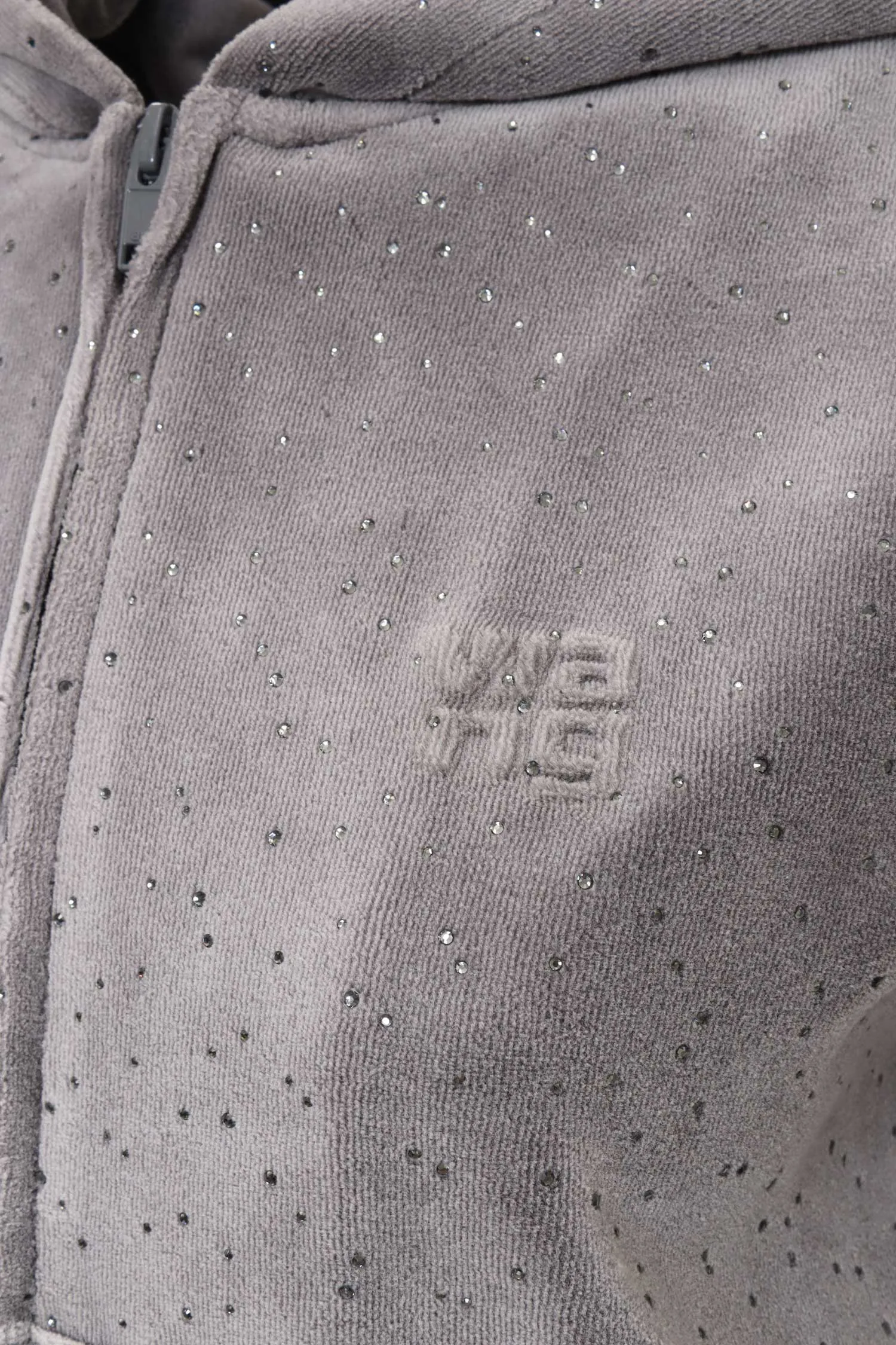 ОЛИМПИЙКА СЕРАЯ В СТРАЗАХ, БАРХАТНАЯ, УКОРОЧЕННАЯ, НАКЛАДНЫЕ КАРМАНЫ, КАПЮШОН