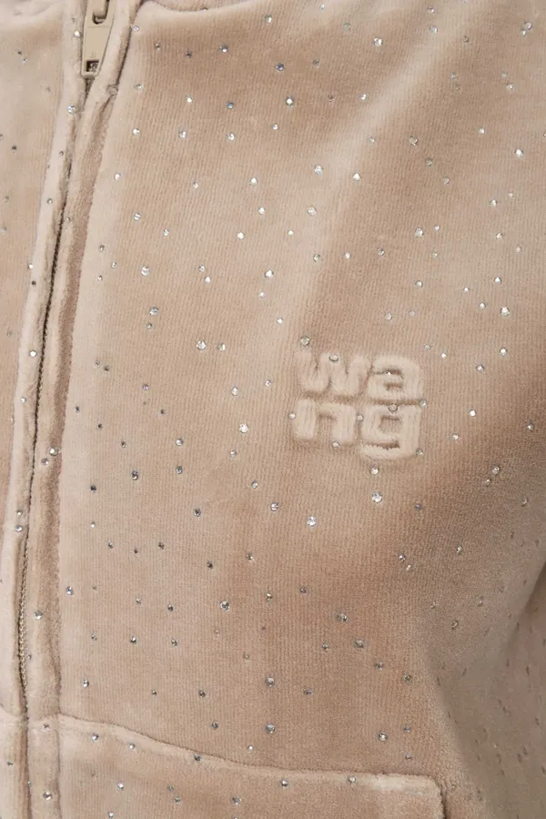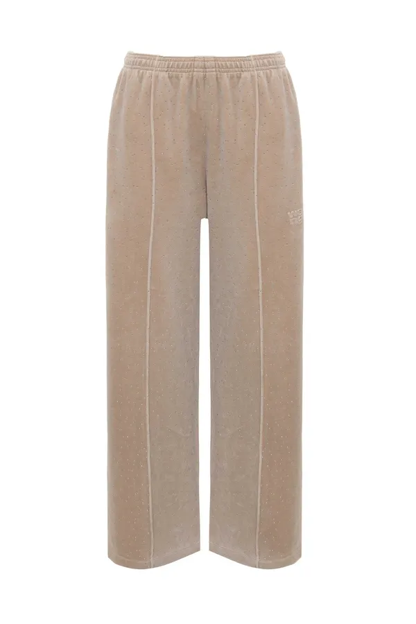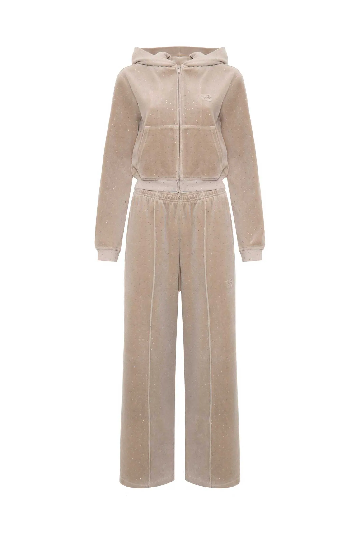 КОСТЮМ M.694 СЕРО-КОРИЧНЕВЫЙ В СТРАЗАХ, БАРХАТНЫЙ, ОЛИМПИЙКА УКОРОЧЕННАЯ+ШТАНЫ СВОБОДНЫЕ, ОТСТРОЧЕН.СТРЕЛКИ, КАПЮШОН