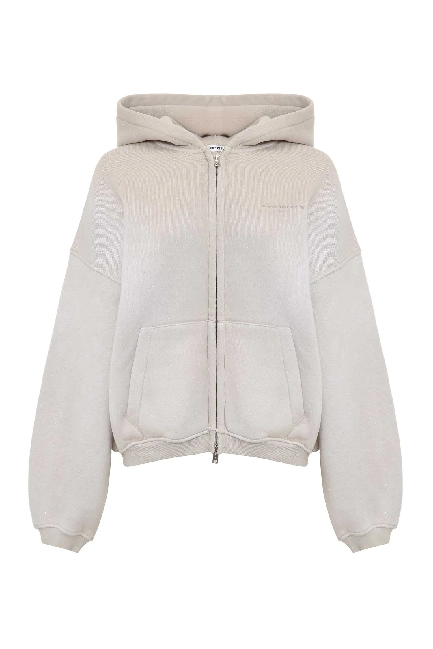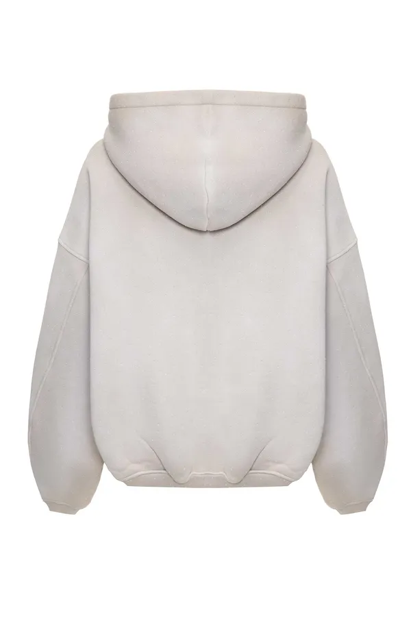 ОЛИМПИЙКА СЕРО-БЕЖЕВАЯ В СТРАЗАХ, ВЫБЕЛЕННАЯ, УТЕПЛЁННАЯ, СПЕРЕДИ КАРМАНЫ, КАПЮШОН