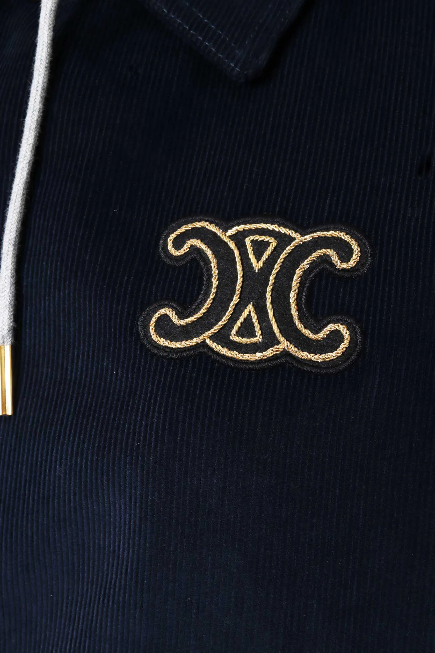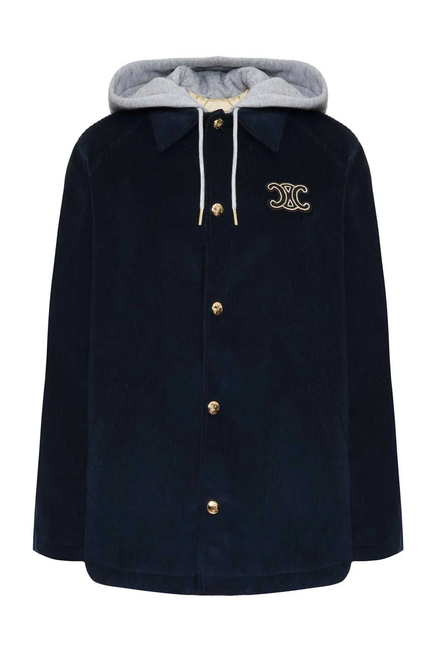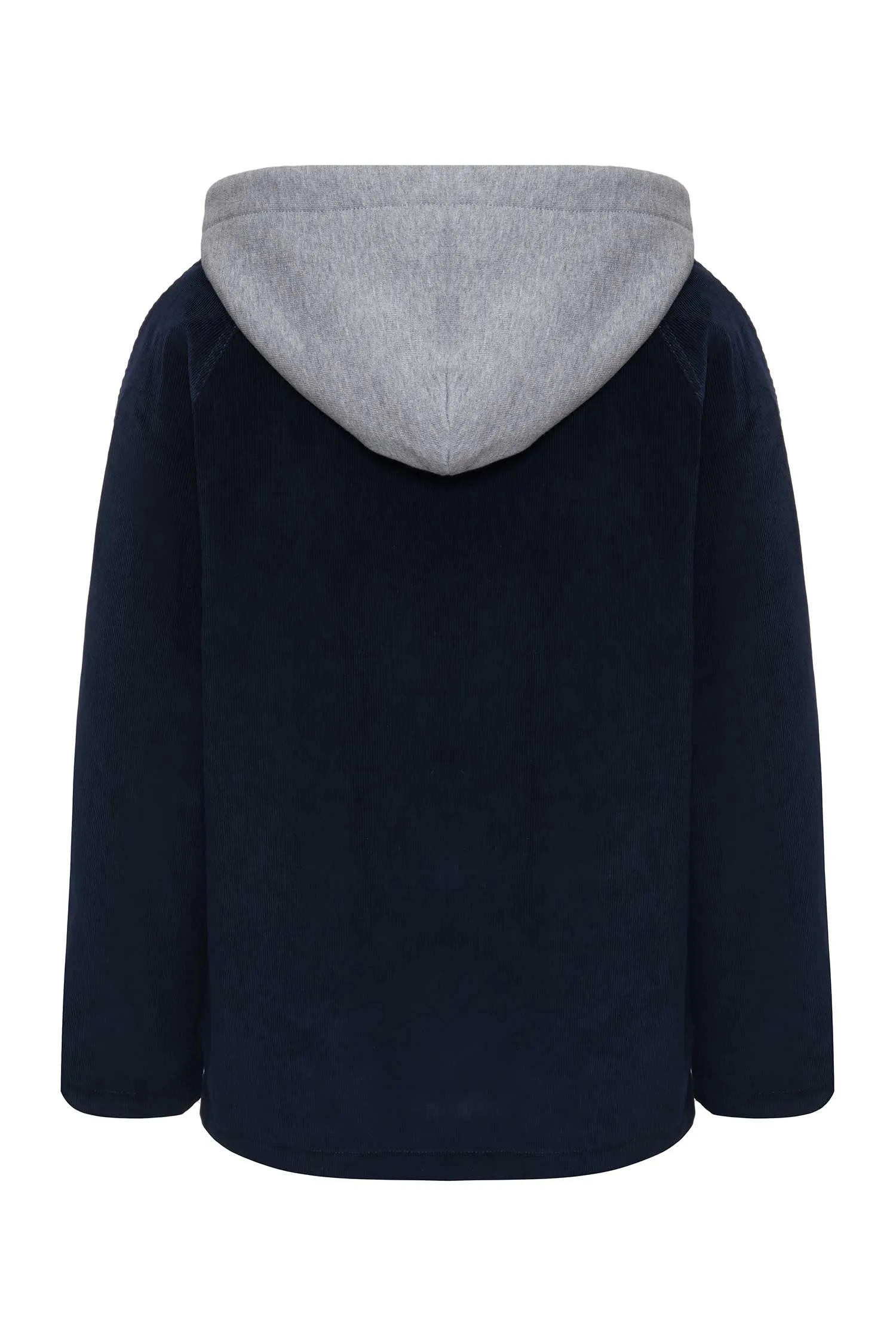 КУРТКА-РУБАШКА Т/СИНЯЯ, ВЕЛЬВЕТОВАЯ, НА ГРУДИ НАШИВКА-ЛОГО, ЗОЛОТИСТЫЕ ПУГОВИЦЫ, СЕРЫЙ КАПЮШОН