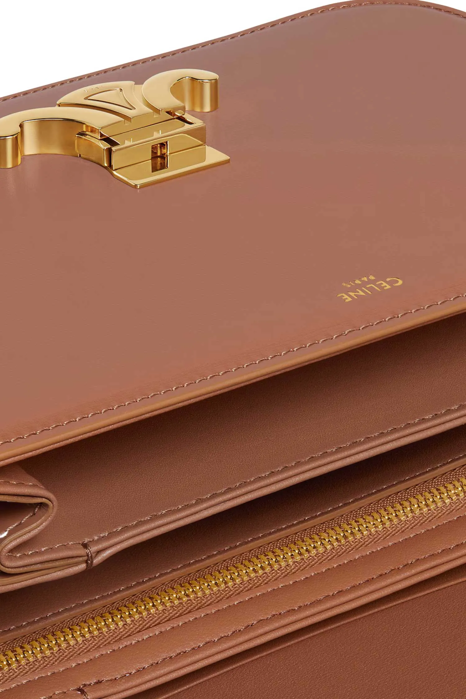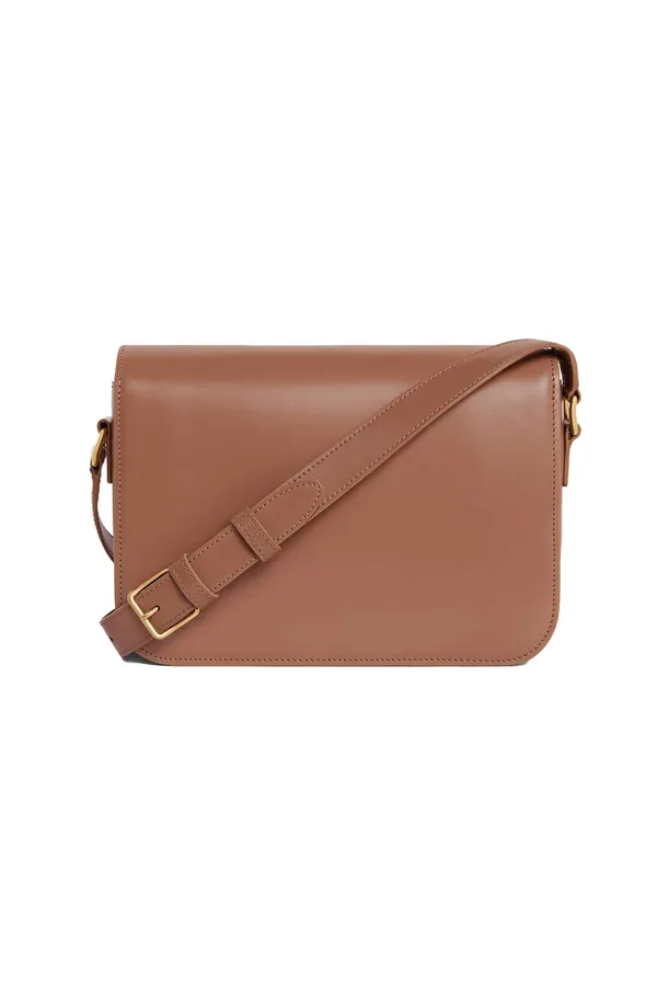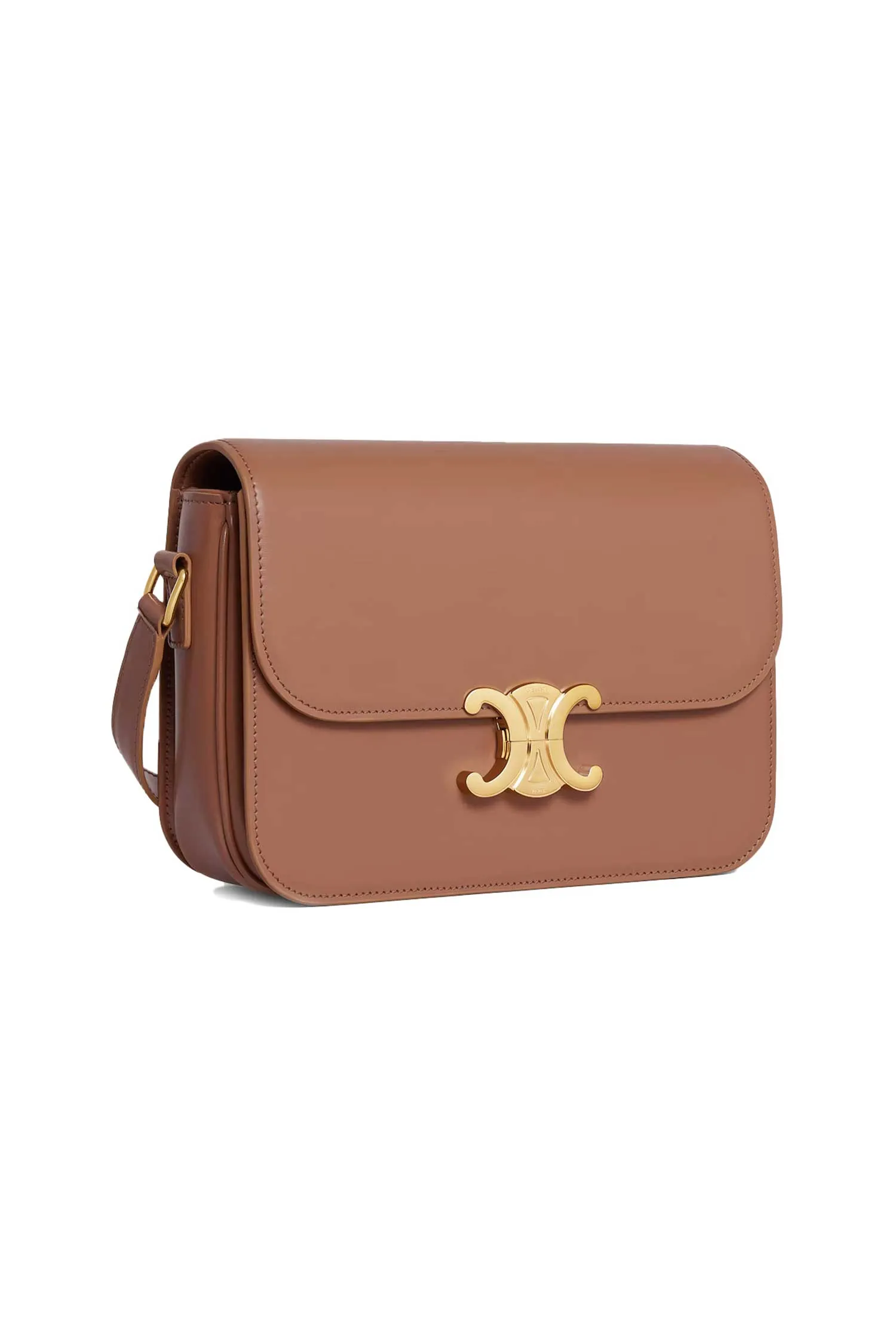 СУМКА TRIOMPHE MEDIUM КОРИЧНЕВАЯ, БЛЕСТЯЩАЯ КОЖА, С КЛАПАНОМ, ЗОЛОТИСТАЯ ПРЯЖКА-ЛОГО, РЕМЕШОК
