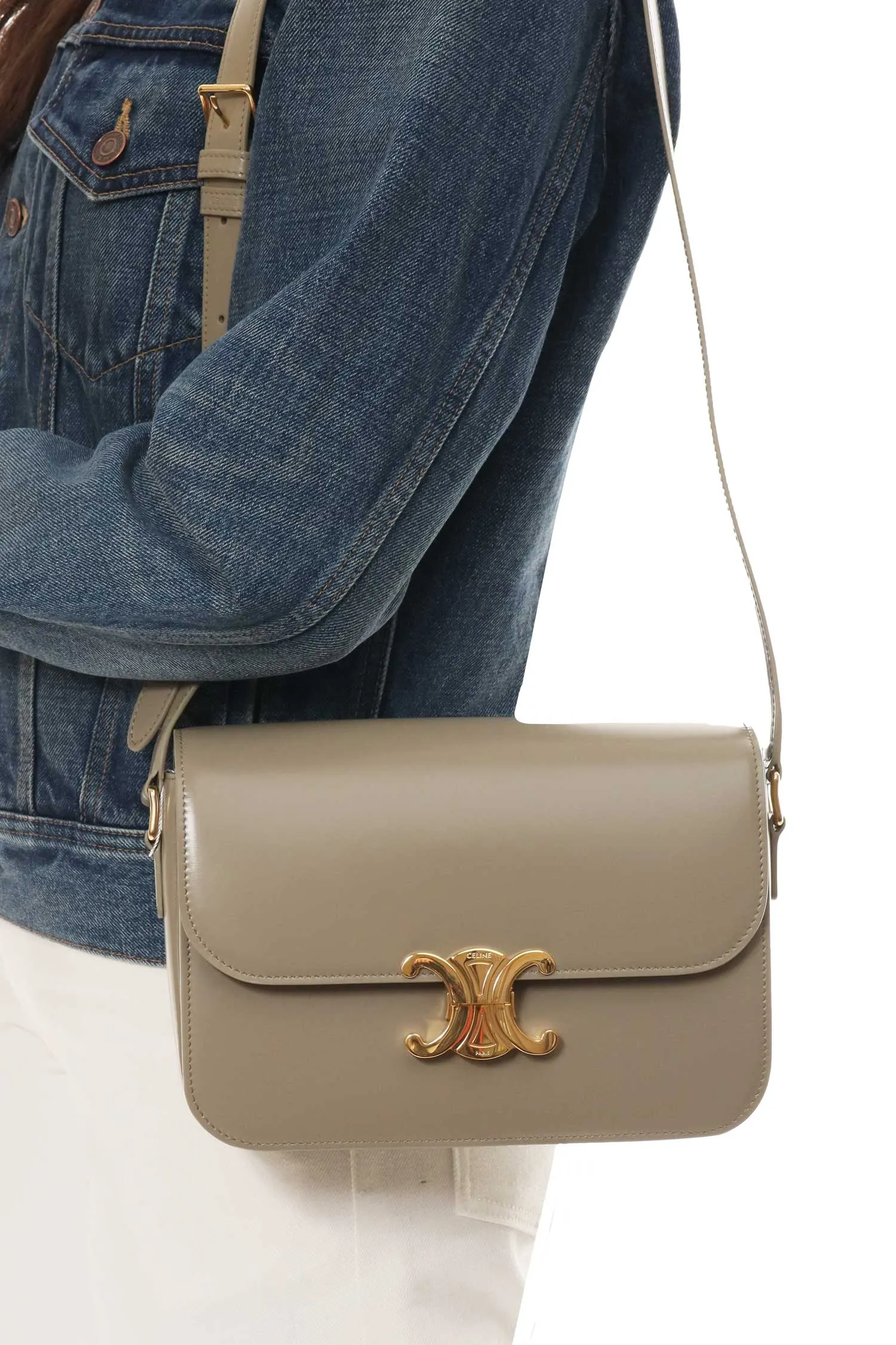 СУМКА TRIOMPHE MEDIUM БЕЖЕВО-МОЛОЧНАЯ, БЛЕСТЯЩАЯ КОЖА, С КЛАПАНОМ, ЗОЛОТИСТАЯ ПРЯЖКА-ЛОГО, РЕМЕШОК