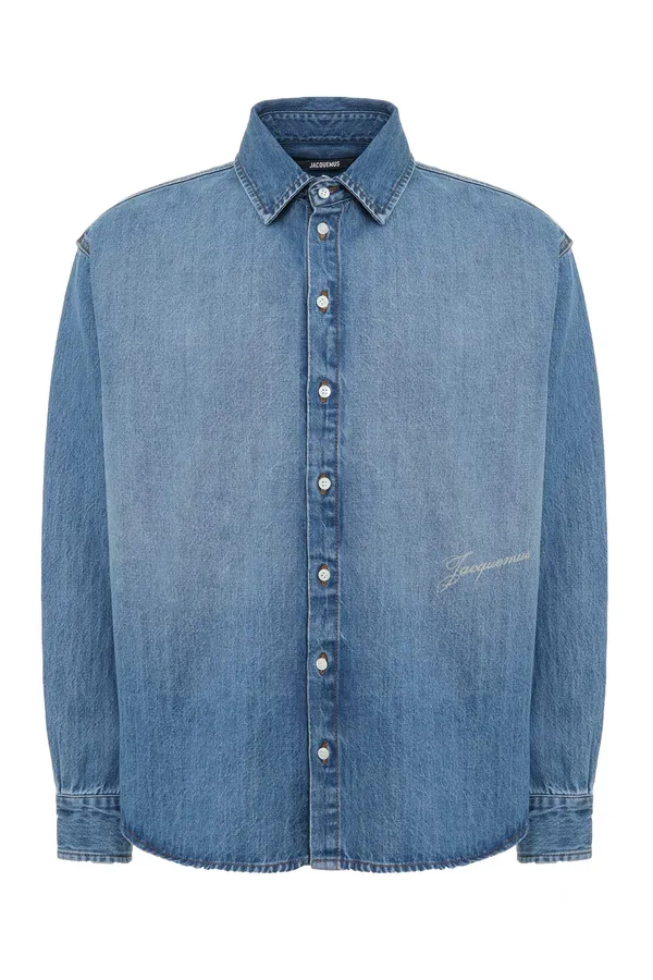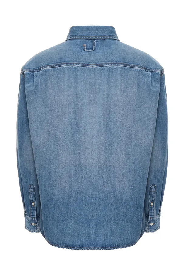 РУБАШКА СИНЯЯ, ДЖИНСОВАЯ, СВОБОДНАЯ, БЕЖЕВАЯ ЛОГО-НАДПИСЬ