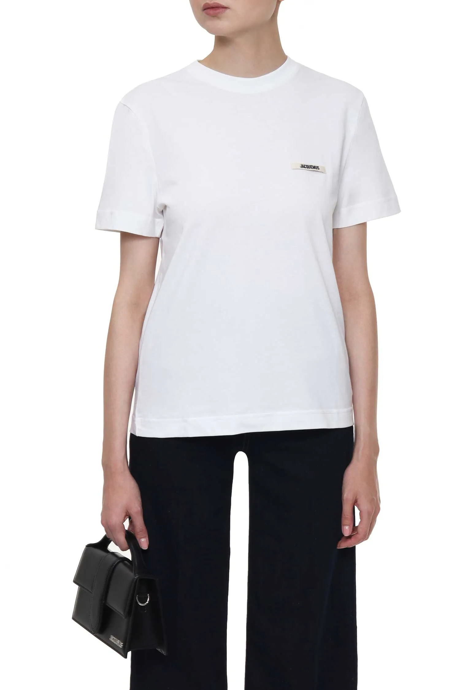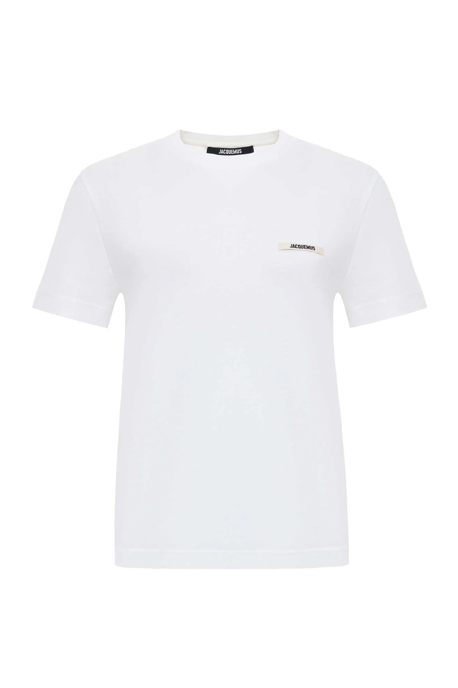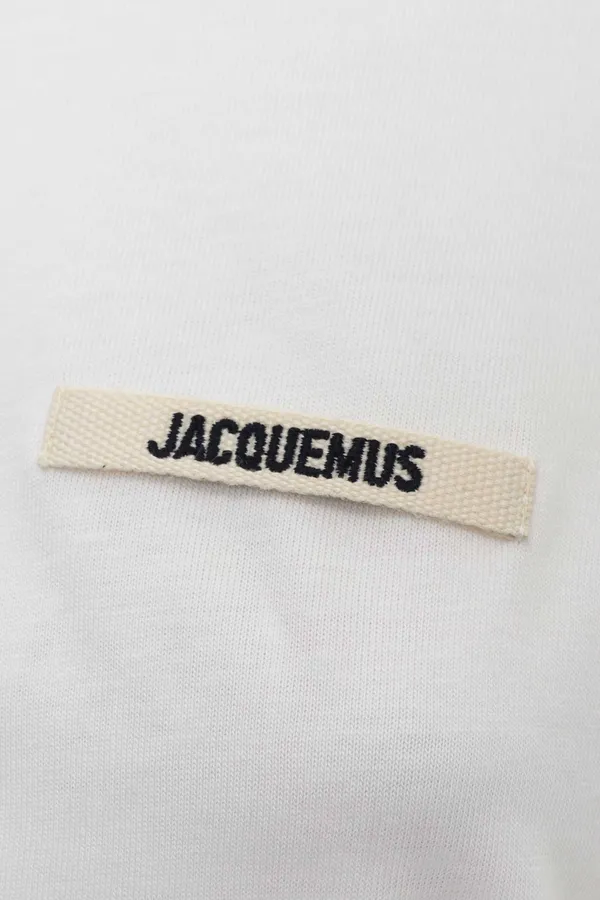 JACQUEMUS ФУТБОЛКА M.550 БЕЛАЯ, УКОРОЧЕННАЯ, НА ГРУДИ МАЛЕНЬКАЯ МОЛОЧНАЯ НАШИВКА-ЛОГО