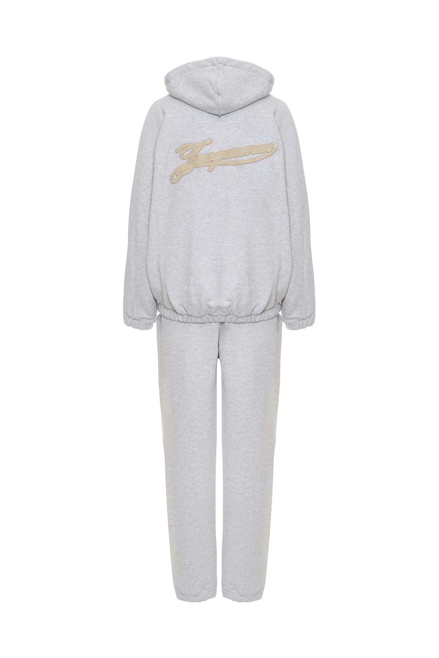 КОСТЮМ СВ/СЕРЫЙ МЕЛАНЖ, ОЛИМПИЙКА С КАПЮШОНОМ+ШТАНЫ НА КУЛИСКЕ, УТЕПЛЁННЫЙ, НА СПИНЕ ВЫШИТАЯ БЕЖЕВАЯ НАШИВКА-ЛОГО