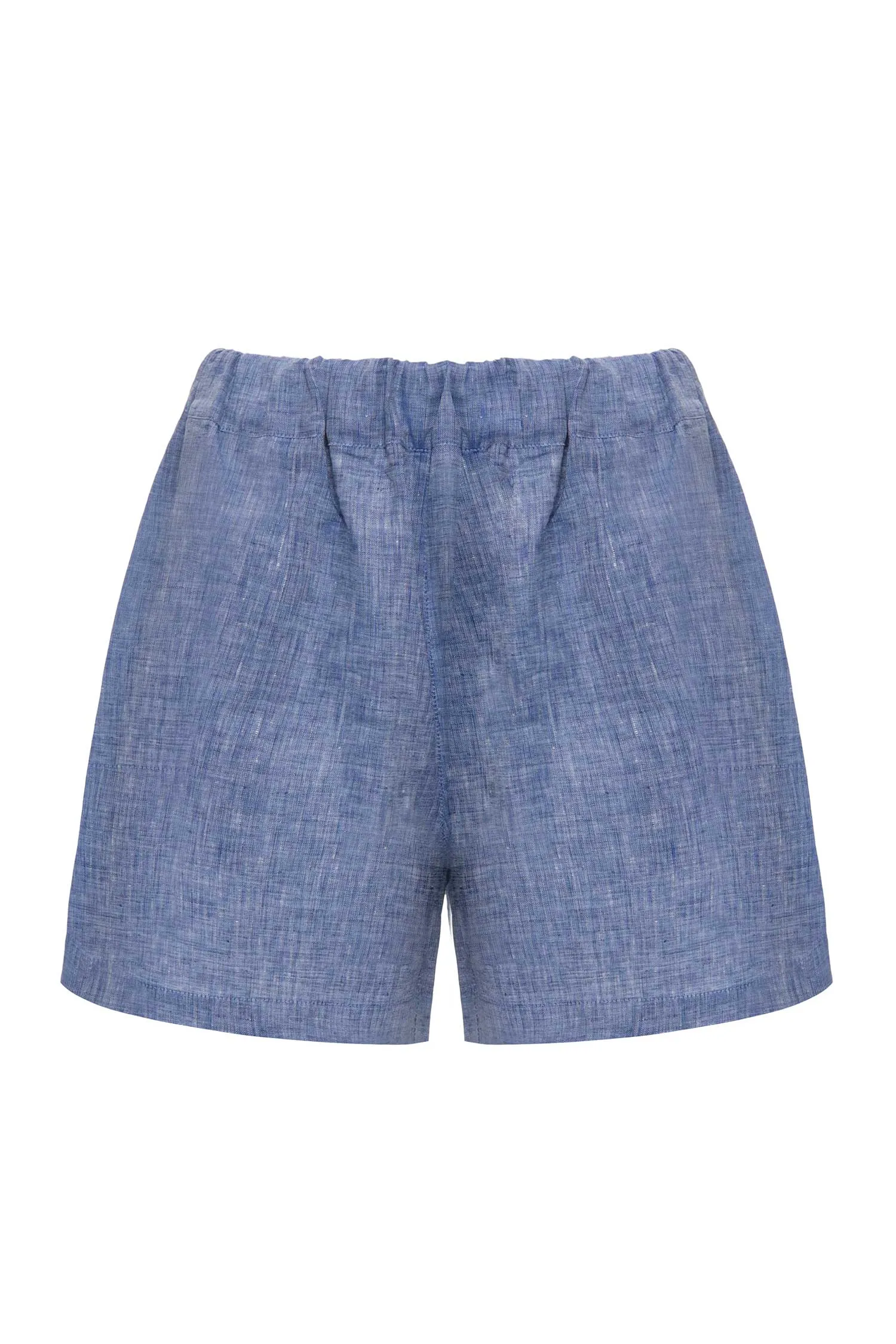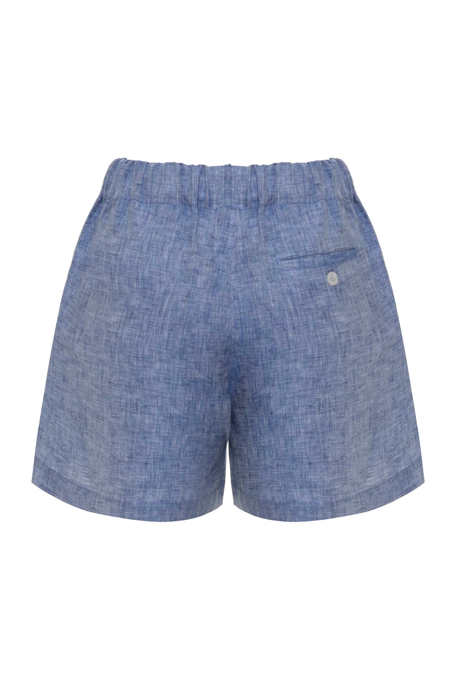 ШОРТЫ M.6 СИНИЕ МЕЛАНЖ, ЛЁН, СВОБОДНЫЕ, ЭЛАСТИЧНЫЙ ПОЯС НА РЕЗИНКЕ, БОКОВЫЕ КАРМАНЫ, СЗАДИ КАРМАН НА ПУГОВИЦЕ