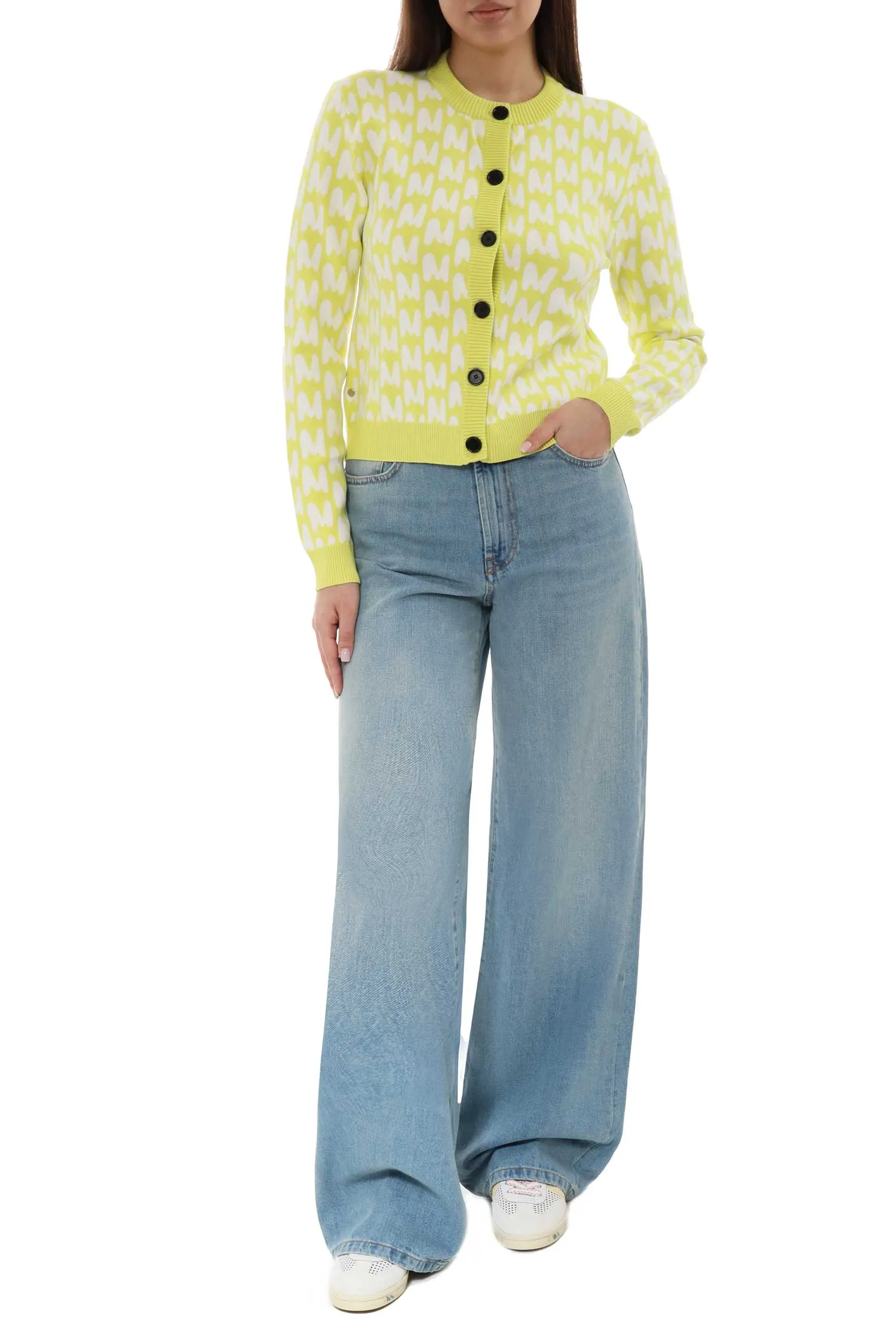 КАРДИГАН M.212 ЛАЙМОВЫЙ В БЕЛОЕ ЛОГО, УКОРОЧЕННЫЙ, ЧЁРНЫЕ ПУГОВИЦЫ