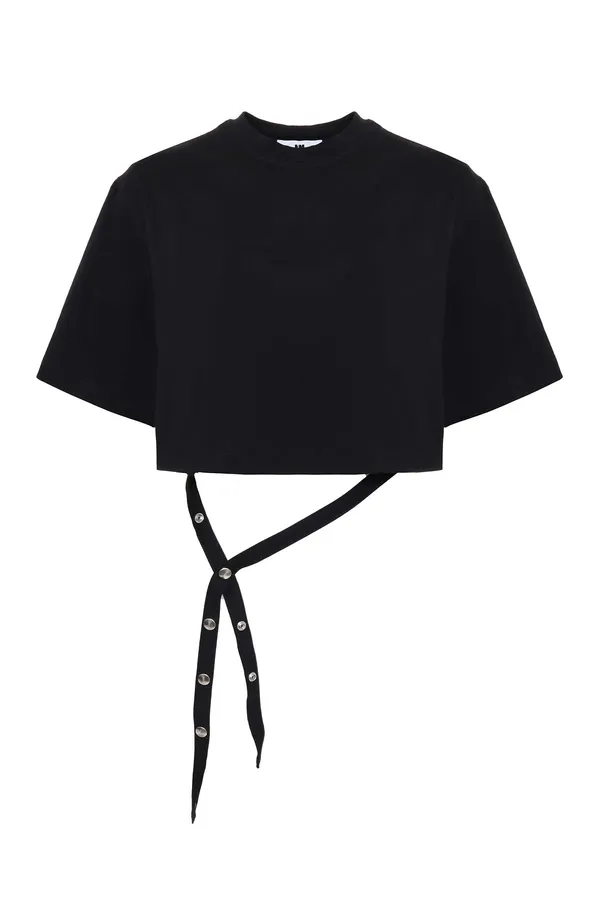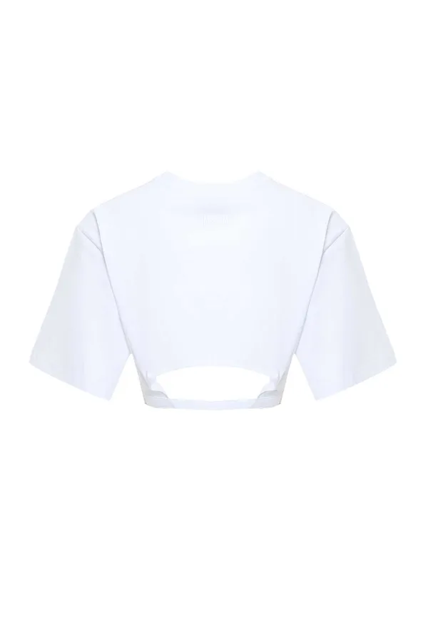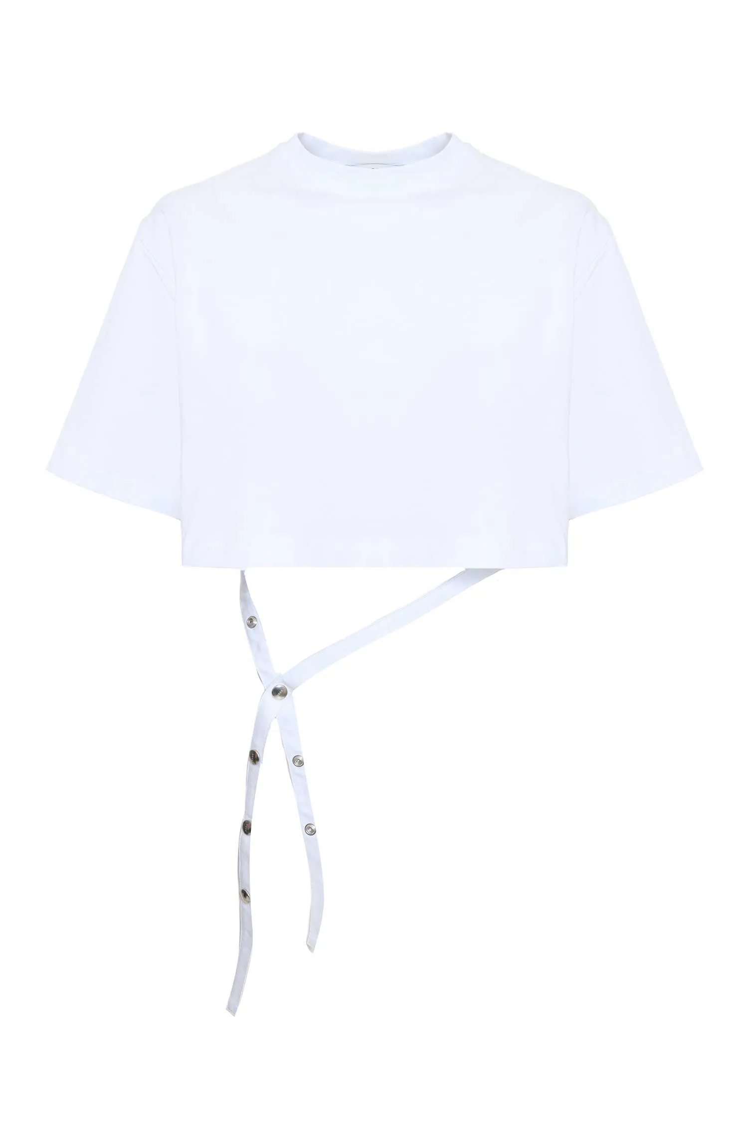 ФУТБОЛКА M.093 БЕЛАЯ, УКОРОЧЕННАЯ, НА СПИНЕ ВЫРЕЗ, ЗАВЯЗКИ НА КНОПКАХ