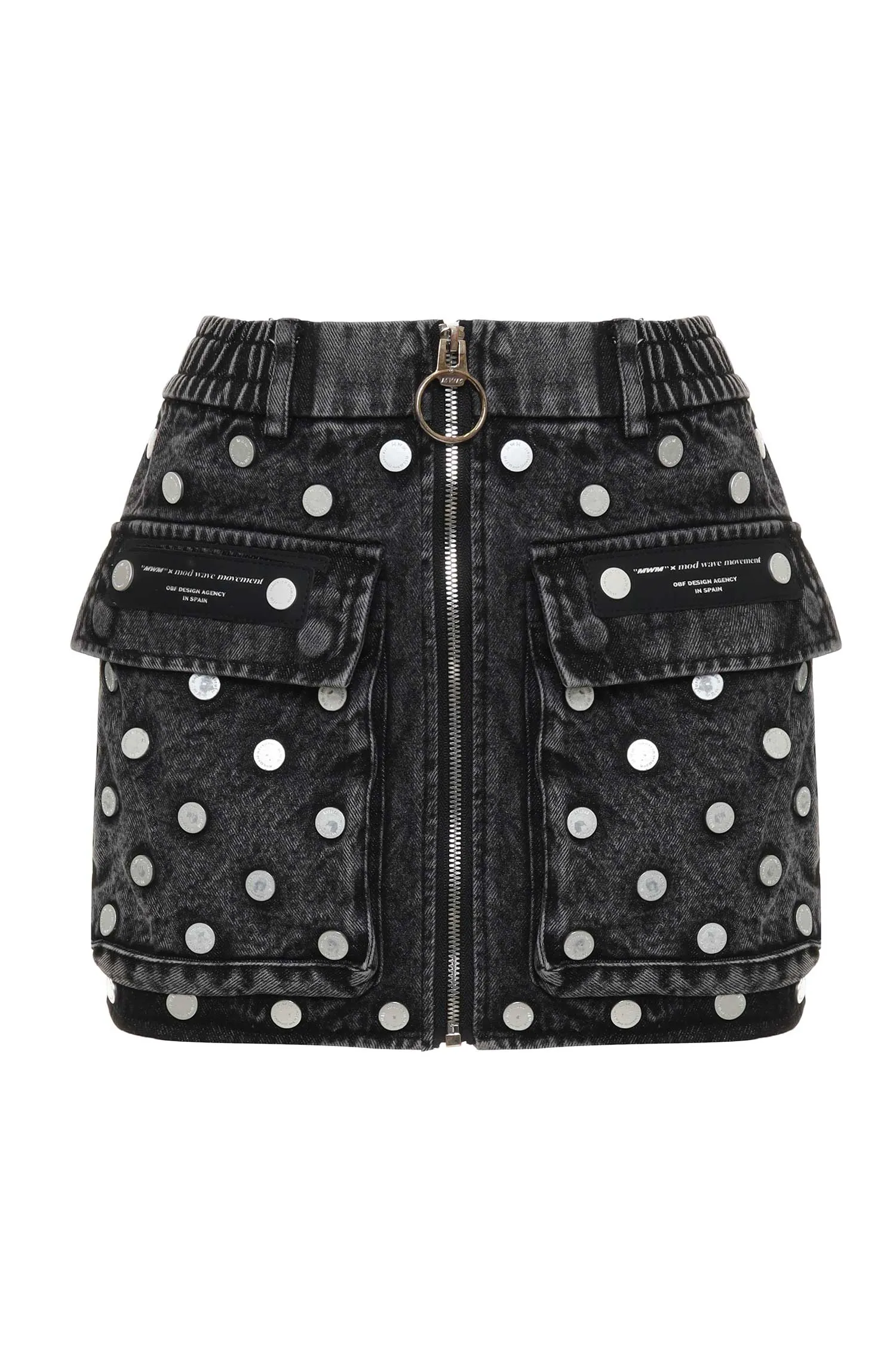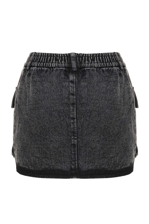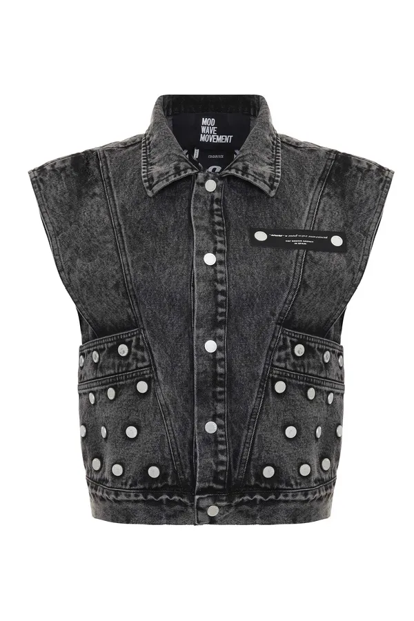 ЮБКА Т/СЕРАЯ, ДЖИНСОВАЯ, ВЫВАРЕННАЯ, КОРОТКАЯ, ОТД.СЕРЕБРИСТЫМИ КЛЁПКАМИ