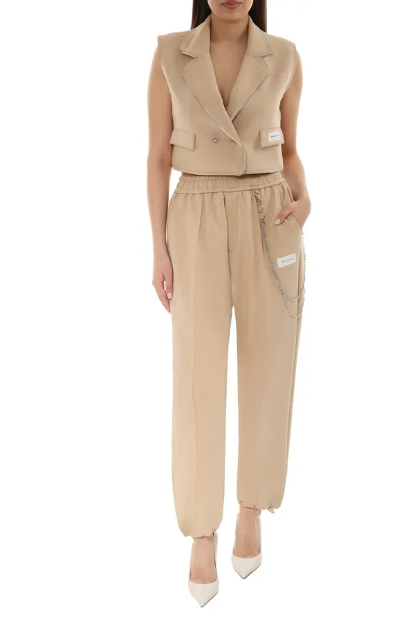 БРЮКИ M.003 БЕЖЕВЫЕ С ОТСТРОЧЕННЫМИ СТРЕЛКАМИ, ПОЯС НА РЕЗИНКЕ, СЗАДИ КАРМАН НА МОЛНИИ, ДЕКОРАТ.ЦЕПОЧКА