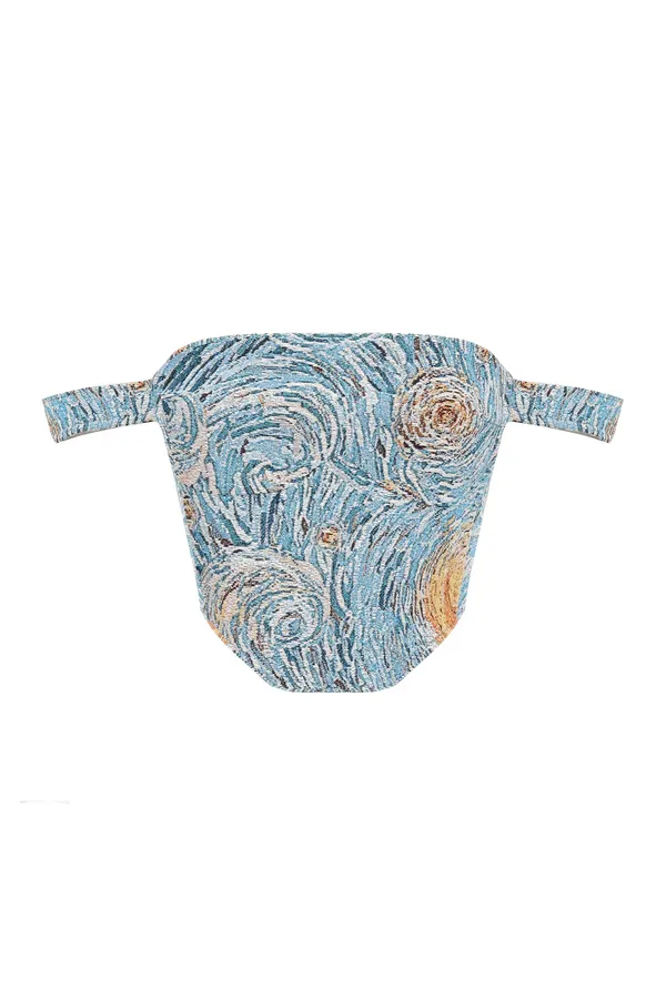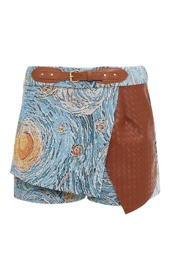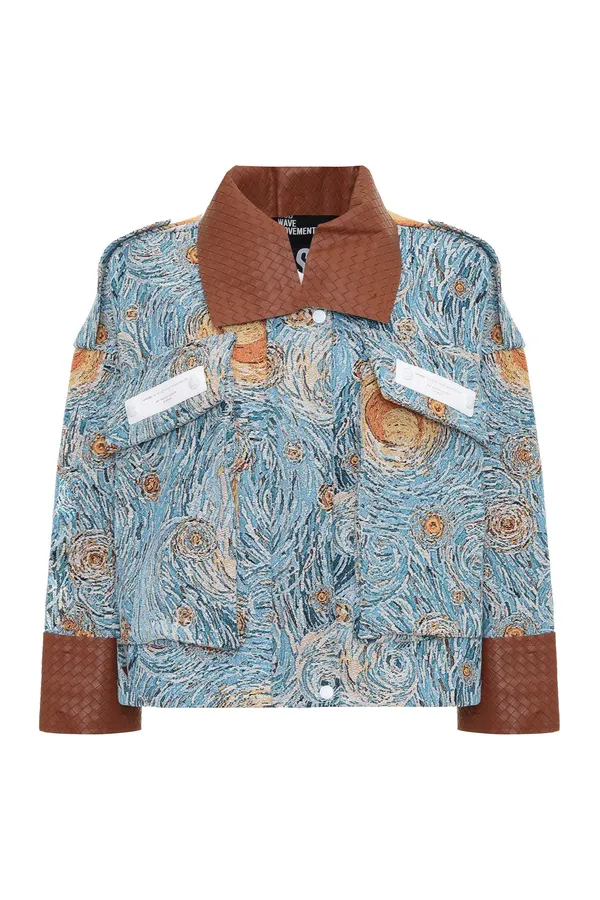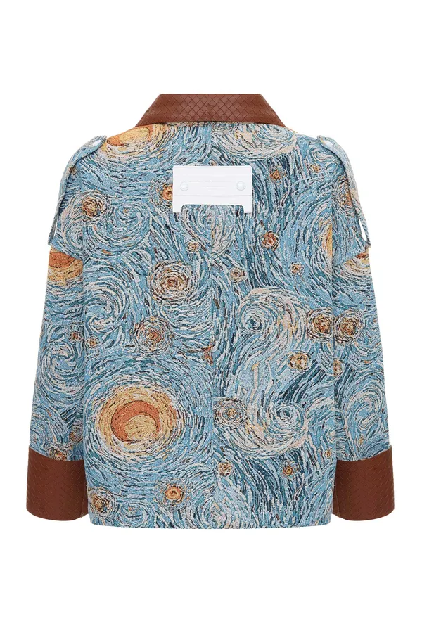 КУРТКА ЖЁЛТО-ГОЛУБАЯ, ПРИНТ ЗВЕЗДНАЯ НОЧЬ, СВОБОДНАЯ, СЪЁМНЫЕ МАНЖЕТЫ И ВОРОТНИК ИЗ КОРИЧНЕВОЙ ЭКОКОЖИ