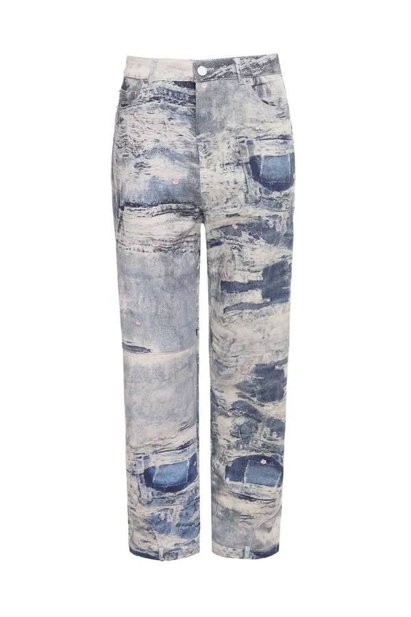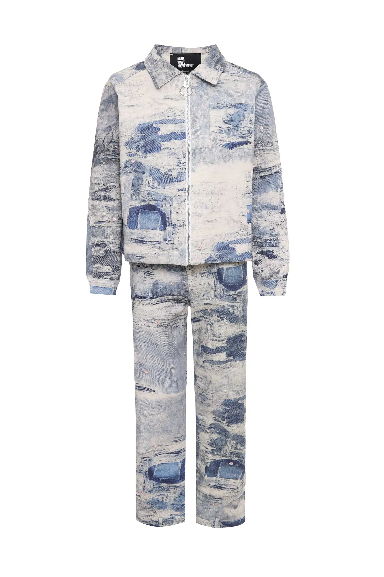 КОСТЮМ МОЛОЧНО-СИНИЙ, ДЖИНСОВЫЙ, ПРИНТ ЭФФЕКТ ПОТЁРТОСТИ, КУРТКА НА МОЛНИИ+ШТАНЫ СВОБОДНЫЕ