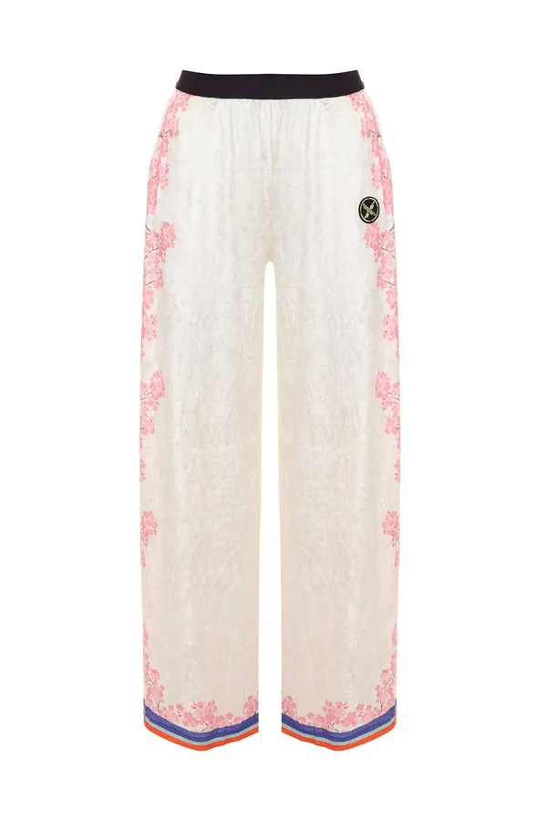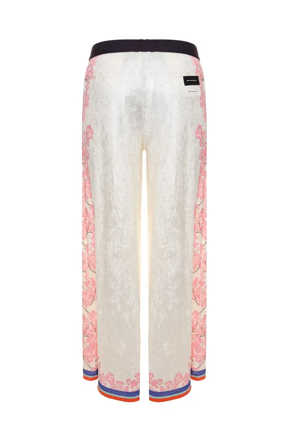 ШТАНЫ МОЛОЧНЫЕ ИЗ ПЛЮША, ПРИНТ РОЗОВЫЕ ЦВЕТЫ, СВОБОДНЫЕ, СНИЗУ СИНИЕ/ОРАНЖЕВЫЕ ПОЛОСЫ, ПОЯС-РЕЗИНКА