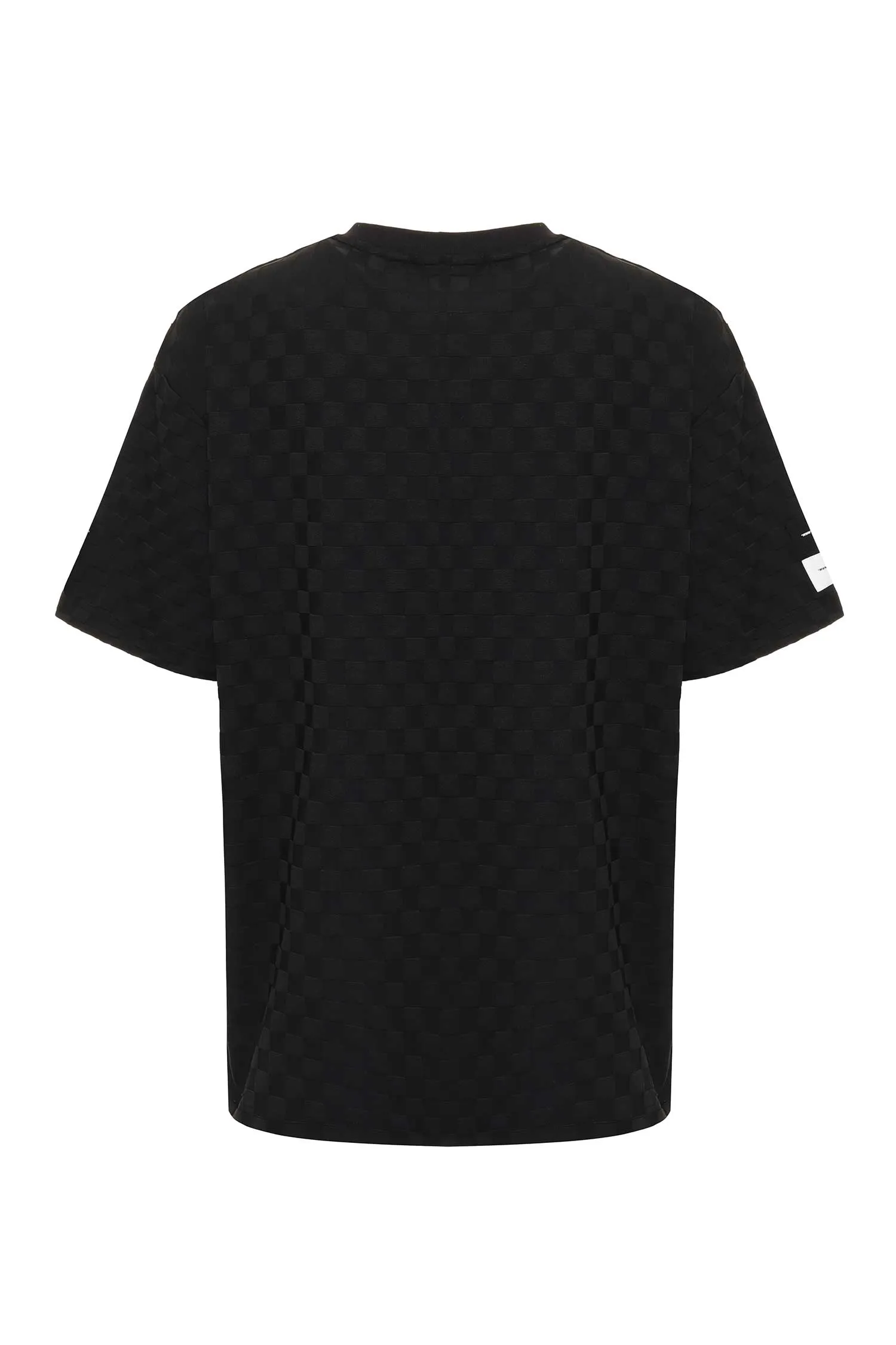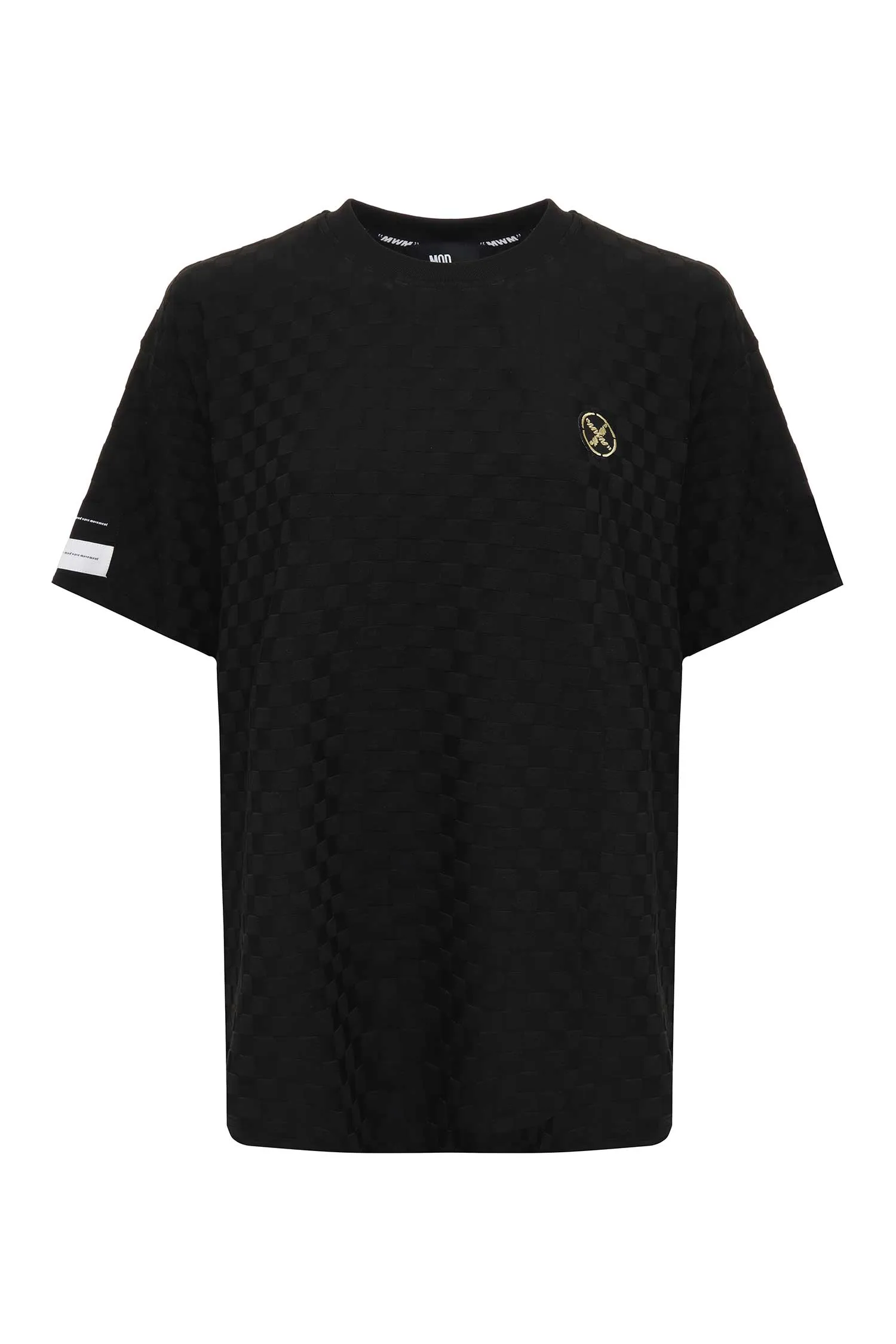 ФУТБОЛКА M.402 ЧЁРНАЯ, ПРИНТ КЛЕТКА, СВОБОДНАЯ, НА ГРУДИ МАЛЕНЬКАЯ НАШИВКА-ЛОГО В ТОН