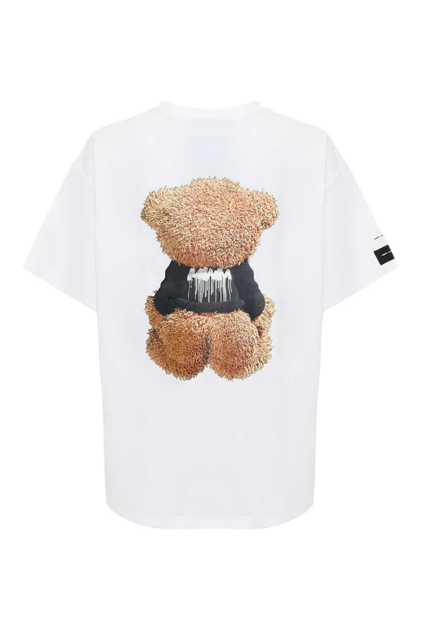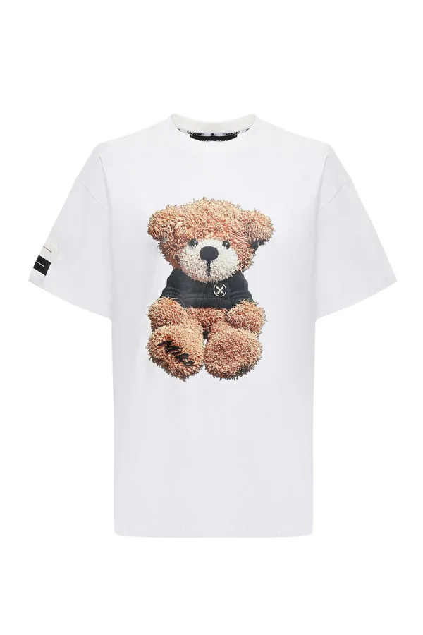 ФУТБОЛКА M.447 БЕЛАЯ, СВОБОДНАЯ, НА ГРУДИ И СПИНЕ КРУПНЫЙ РИС.МИШКА, НА РУКАВЕ БЕЛАЯ/ЧЁРНАЯ НАШИВКИ-ЛОГО