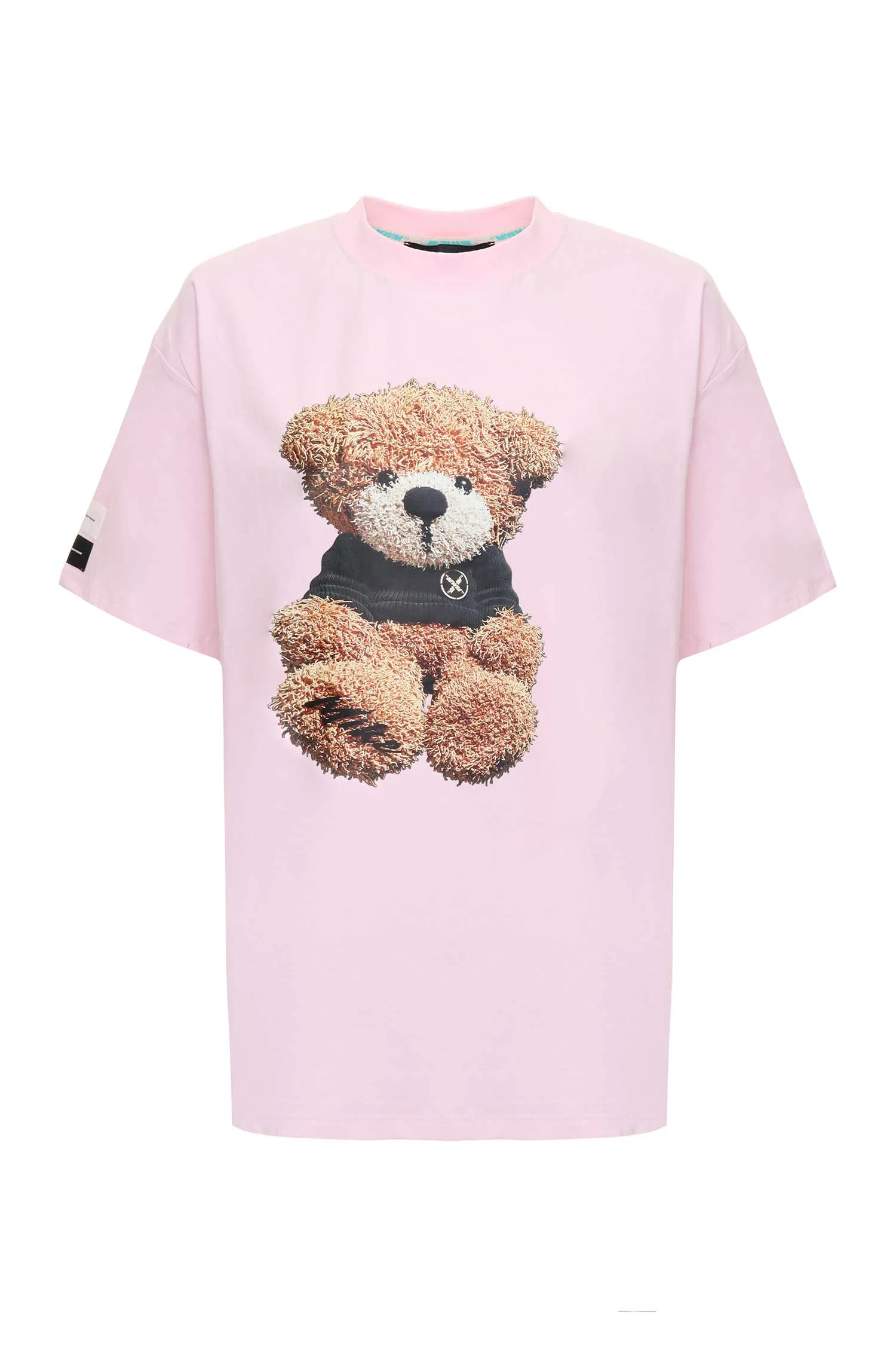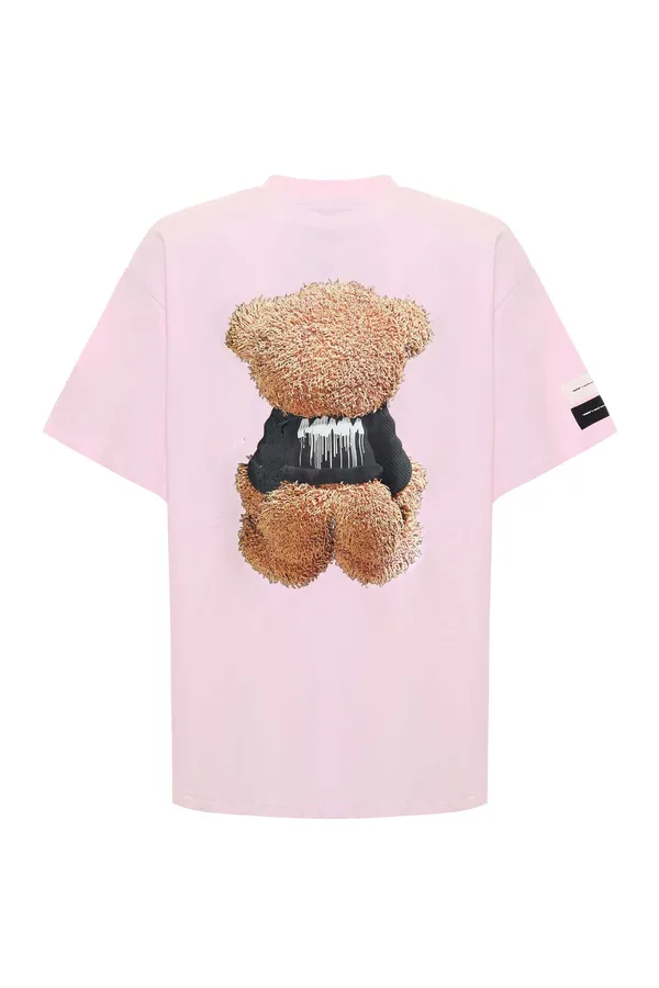 ФУТБОЛКА M.447 РОЗОВАЯ, СВОБОДНАЯ, НА ГРУДИ И СПИНЕ КРУПНЫЙ РИС.МИШКА, НА РУКАВЕ БЕЛАЯ/ЧЁРНАЯ НАШИВКИ-ЛОГО