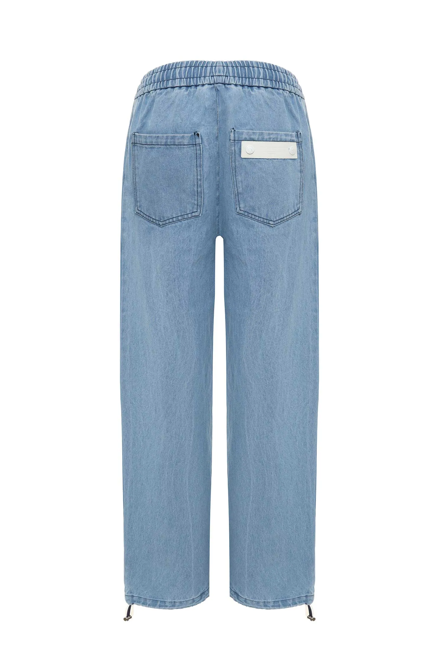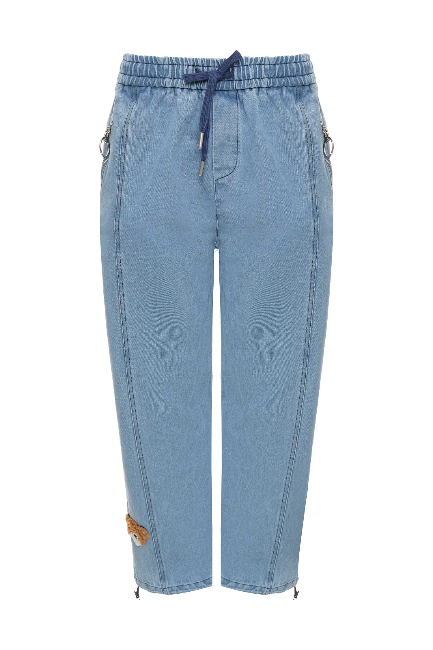 ШТАНЫ ГОЛУБЫЕ, ДЖИНСОВЫЕ, НА КУЛИСКЕ, КАРМАНЫ НА МОЛНИИ, СНИЗУ КОРИЧНЕВАЯ НАШИВКА МИШКА
