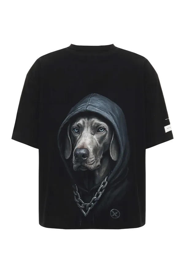 ФУТБОЛКА M.469 ЧЁРНАЯ, НА ГРУДИ КАРМАН И МЯТНАЯ ЛОГО-НАДПИСЬ, НА СПИНЕ РИС.СОБАКА В КАПЮШОНЕ