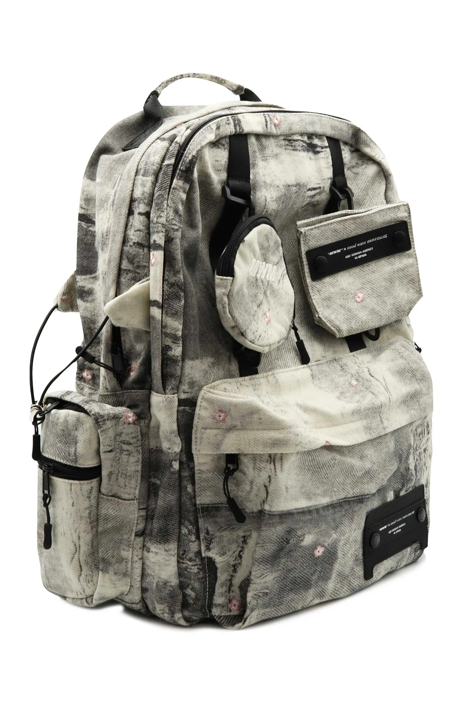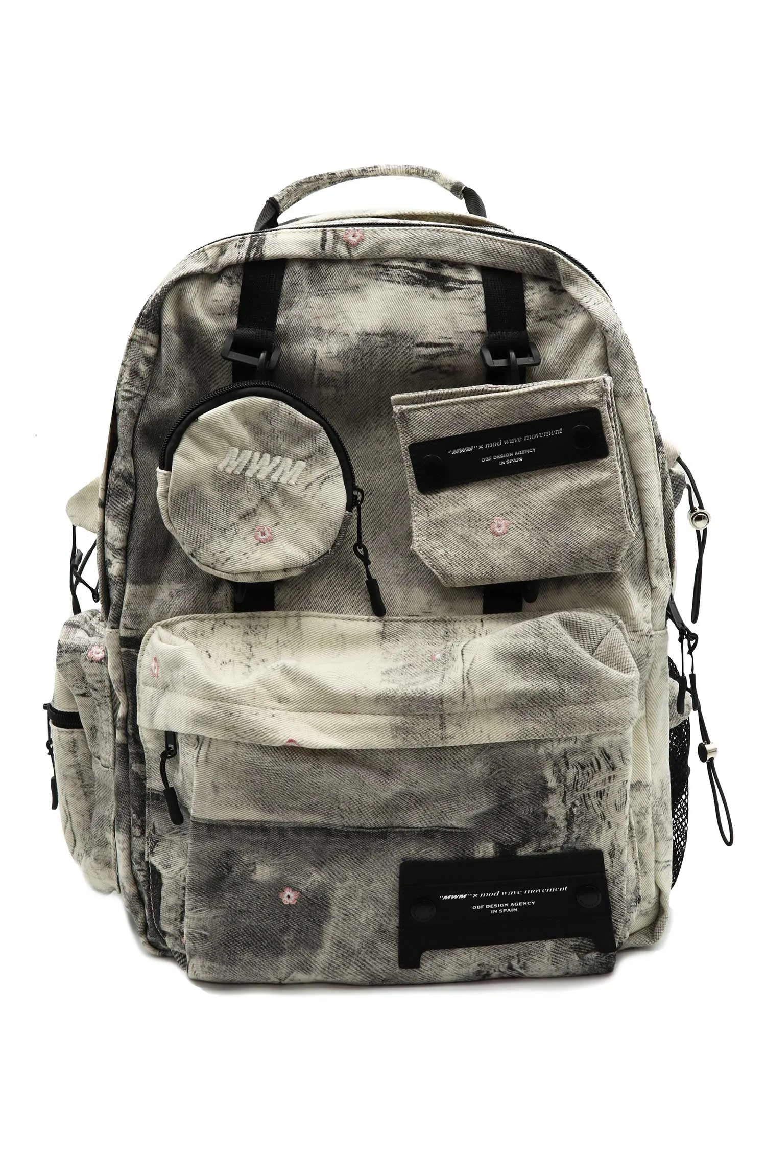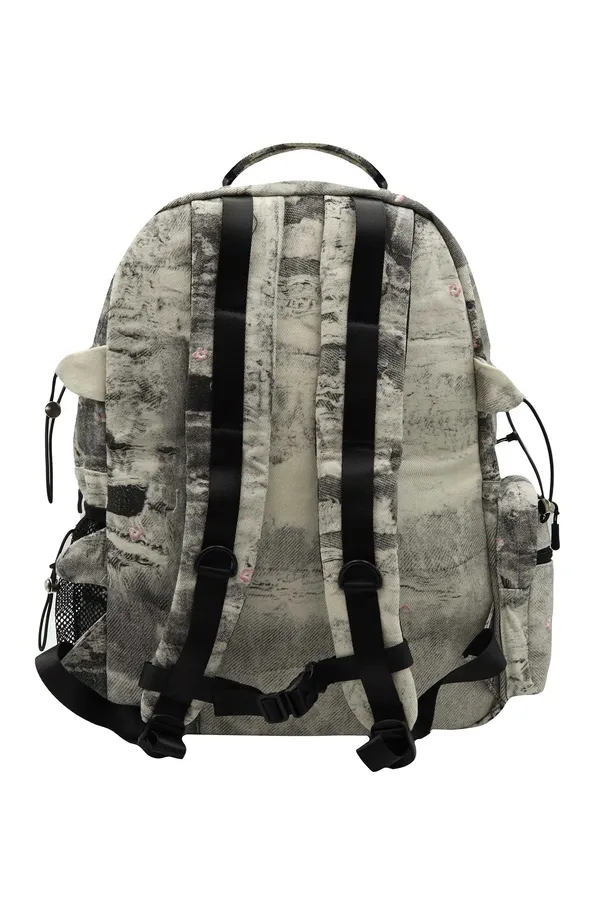 РЮКЗАК ЧЁРНО-БЕЛЫЙ, ДЖИНСОВЫЙ, ОБЪЁМНЫЕ КАРМАНЫ НА МОЛНИИ, СБОКУ КАРМАН ИЗ СЕТКИ, ЧЁРНАЯ НАШИВКА-ЛОГО